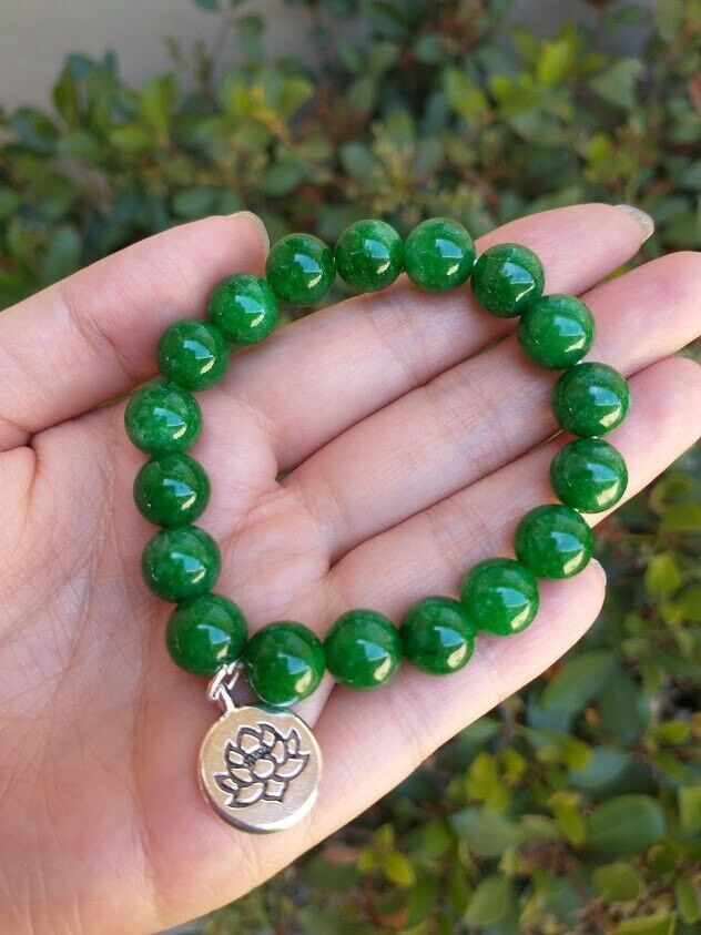 Stretchy 18 10mm Green Jade Beaded Lotus pendant Amulet Bracelet -6"