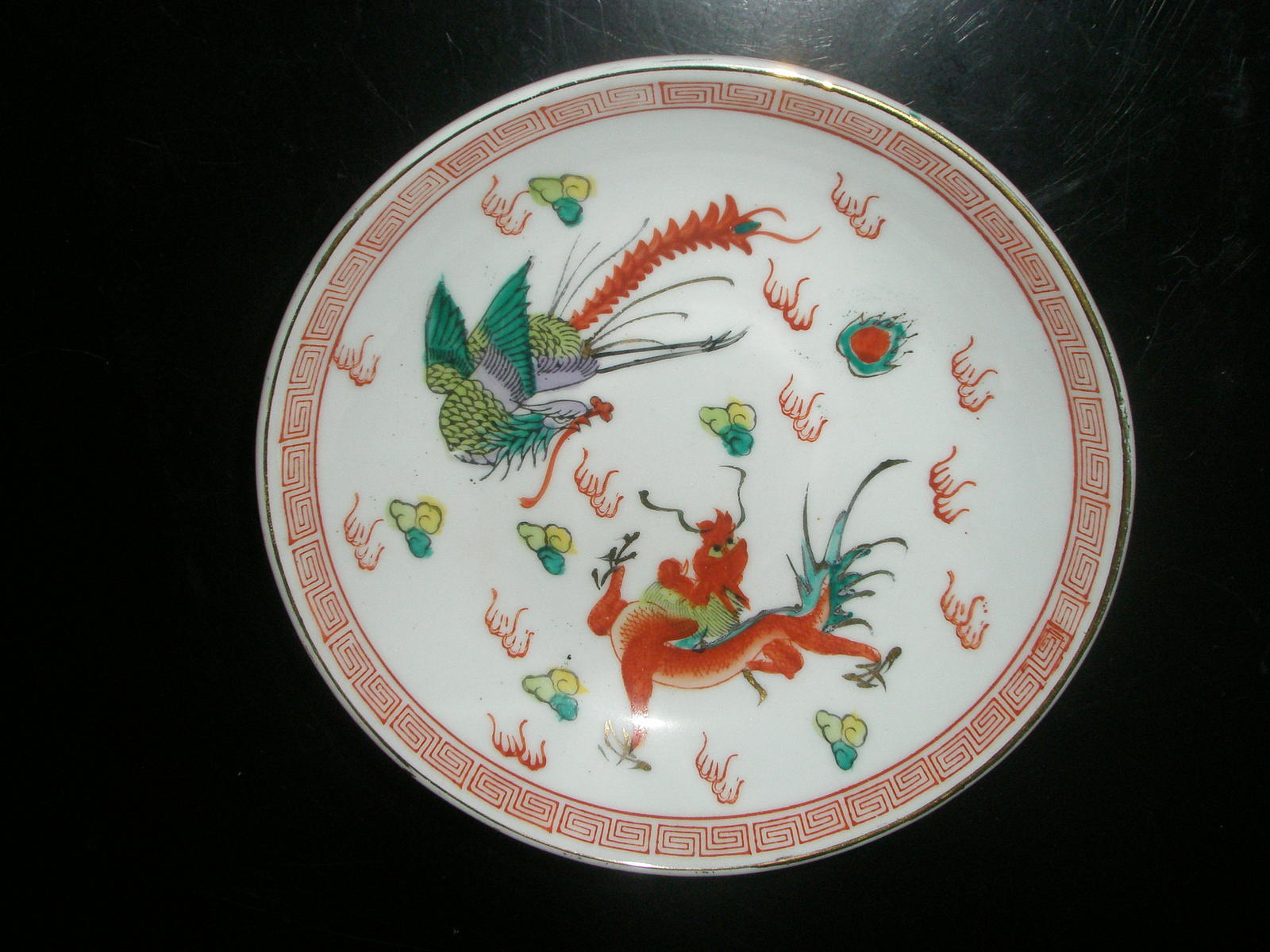 Vintage Chinese Fine Porcelain Red Dragon and Phoenix Bird Bowl Hand Painted. Adorned with clouds. No chips or cracks. A little of the hand painted material has rubbed off not much. Little gold loss around the rim. Very beautiful porcelain bowl. Please let my pictures be part of my description.