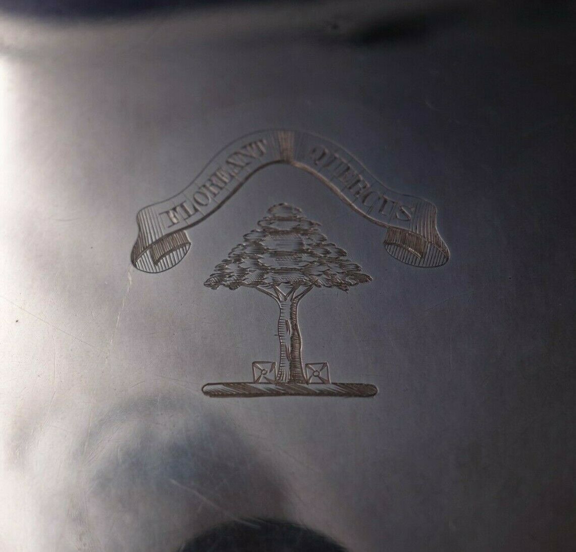Wonderful Gadroon Sheffield silverplate salver tray with crest (see photos), circa 1820 (maker unknown). This piece measures 3/4" tall x 10" in diameter. It is in good vintage condition as shown in the photos. Beautiful!
