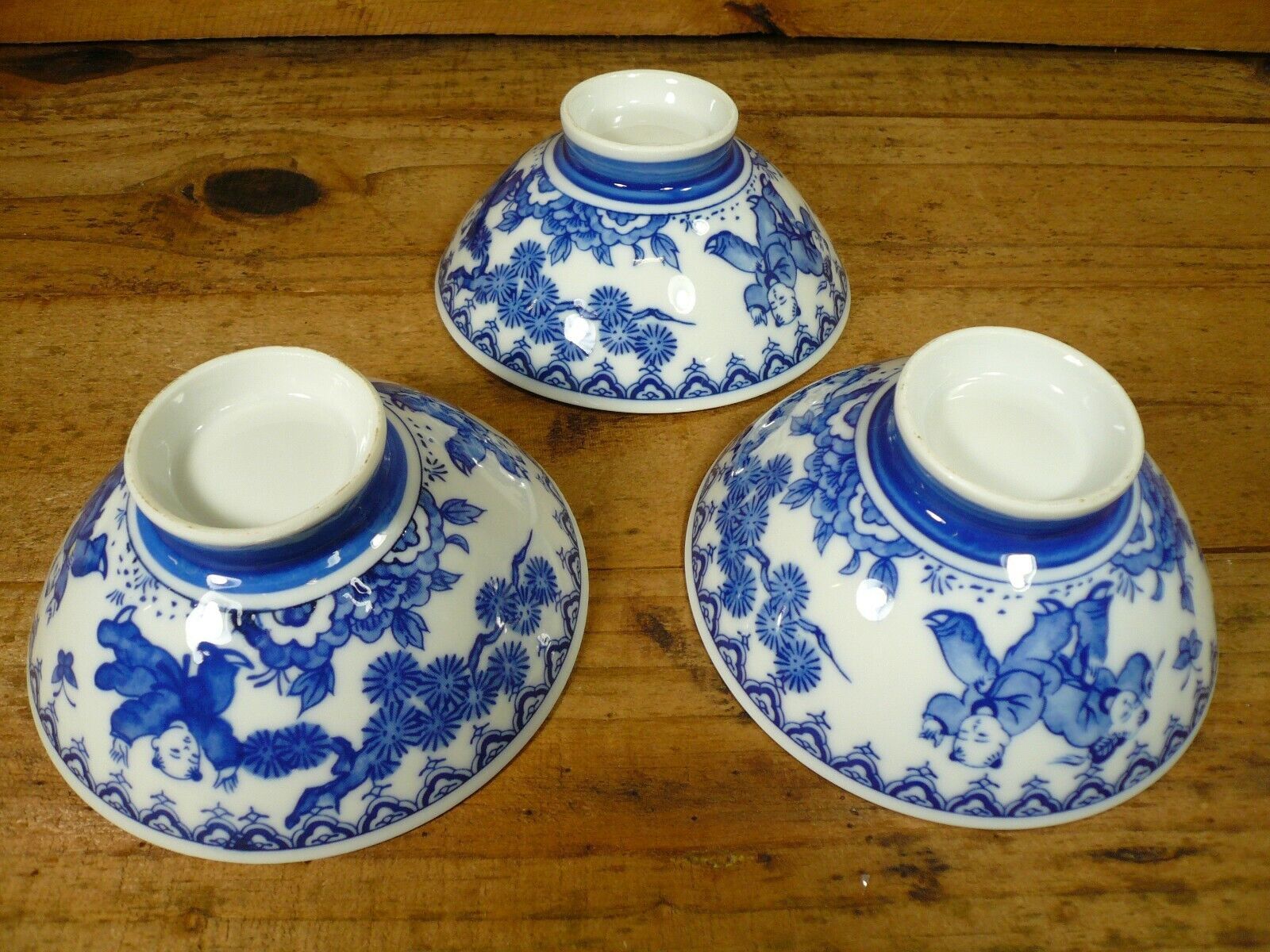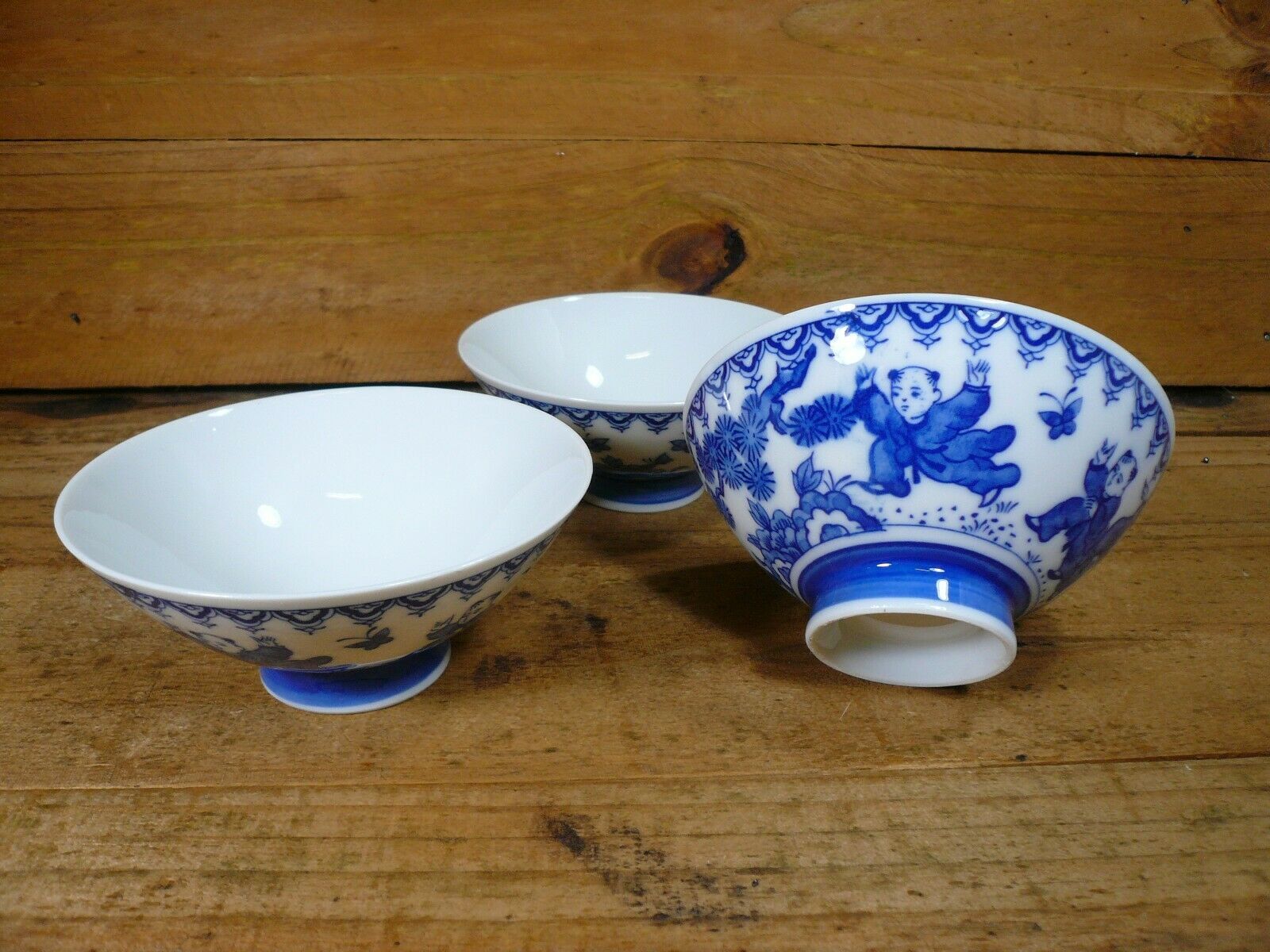 Japanese 3 Fine Porcelain Footed Soup Bowls Boys & Butterflies Blue & White