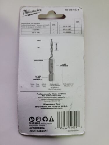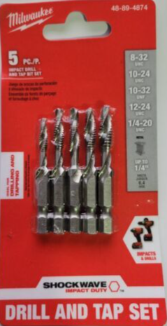You are Buying a Brand New And factory Sealed Milwaukee SHOCKWAVE SAE Steel Drill Tap Set (5-Piece)... 5-Piece SAE Impact Drill Tap Set taps and drills at the same time. The bits features 24 threads per inch and are intended for use in up to 1/4 in. metal and have laser etched sizes for easy size identification. The tap drill bit is design for use in Impact Drivers and Drill Drivers. Laser etched size for easy size identification, 1/4 in. quick change hex shank. Designed for use in impact drivers and drill drivers. For use in up to 1/4 in. metal. Includes: (1) 8-32 UNC Drill Tap, (1) 10-24 UNC Drill Tap, 10-32 UNC Drill Tap, 12-24 UNC Drill Tap, 1/4-20 UNC Drill Tap...