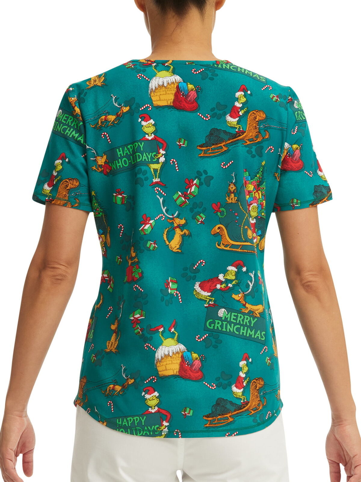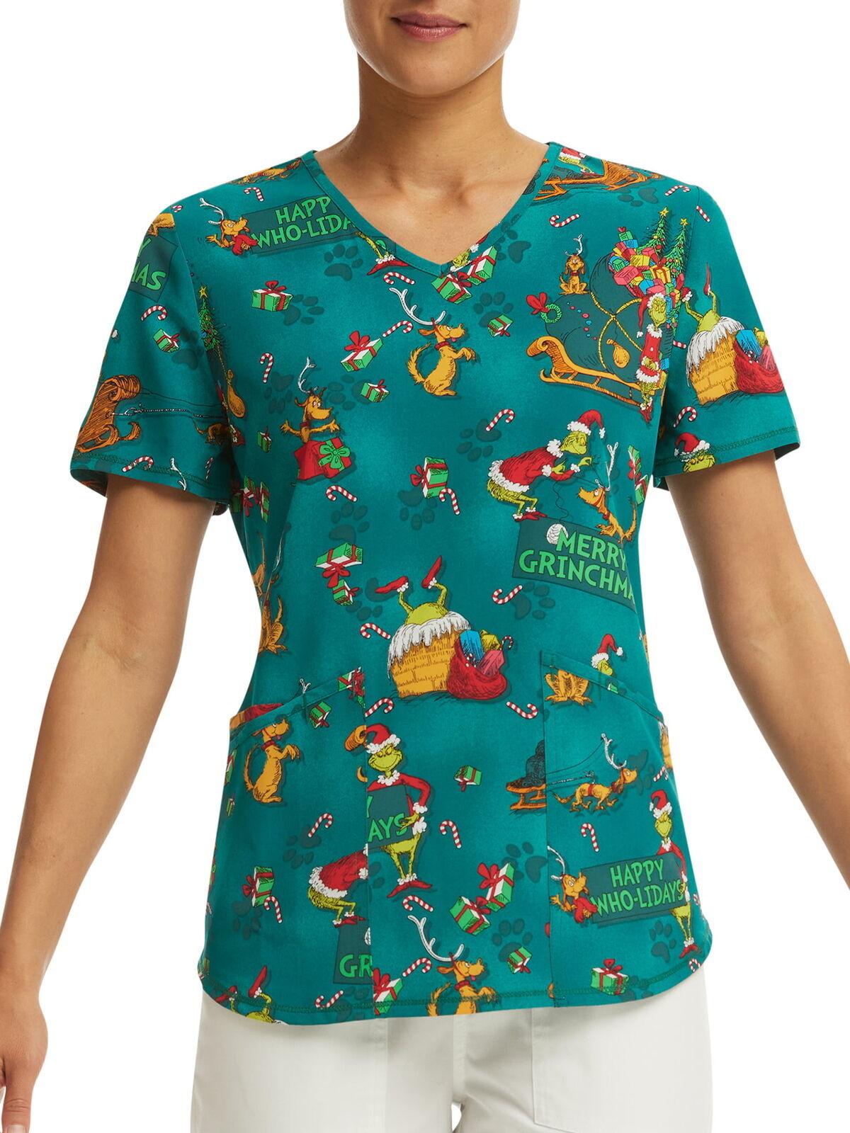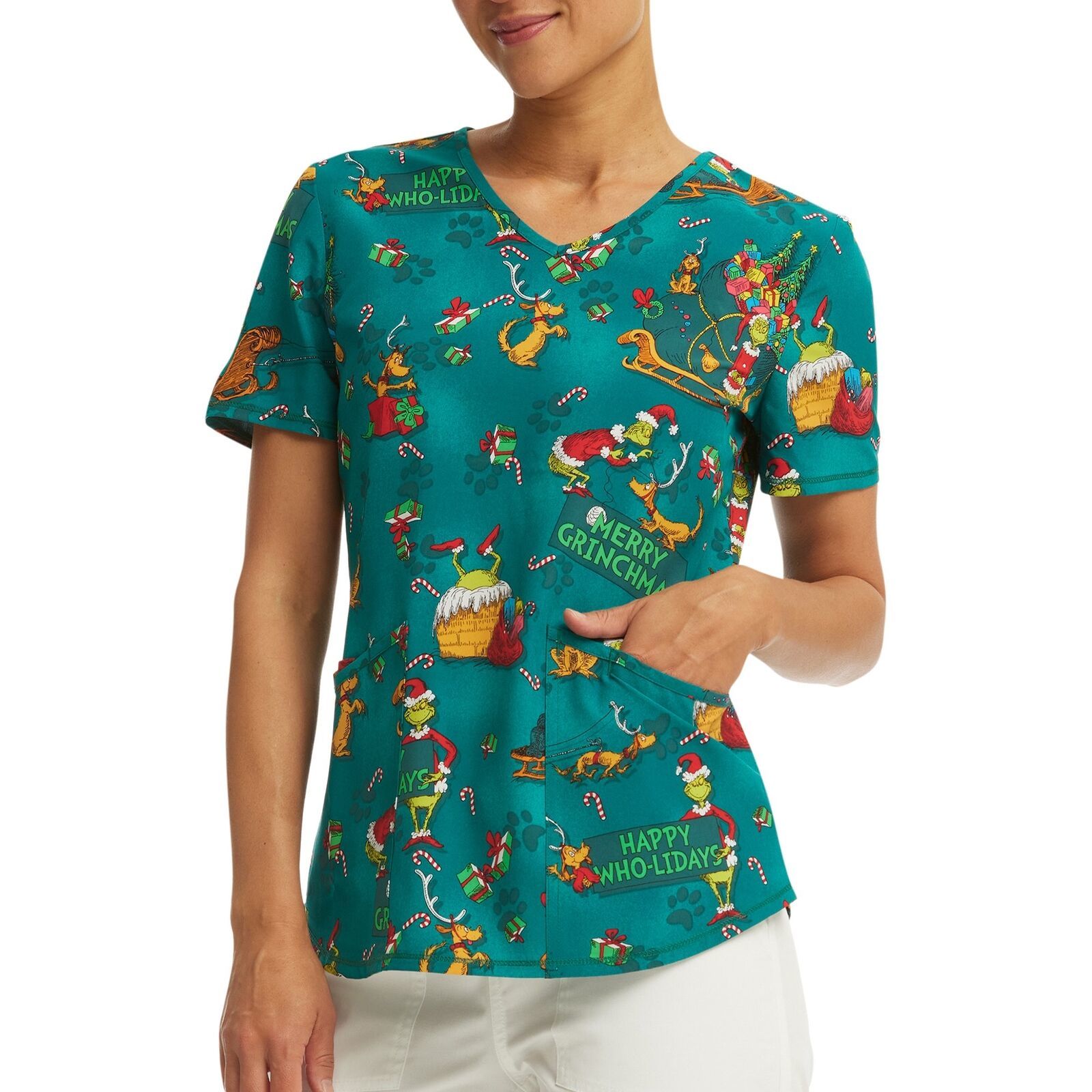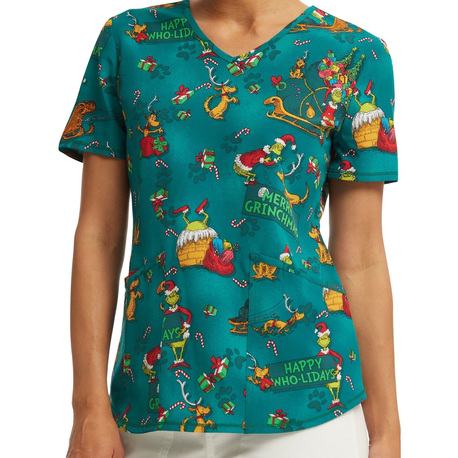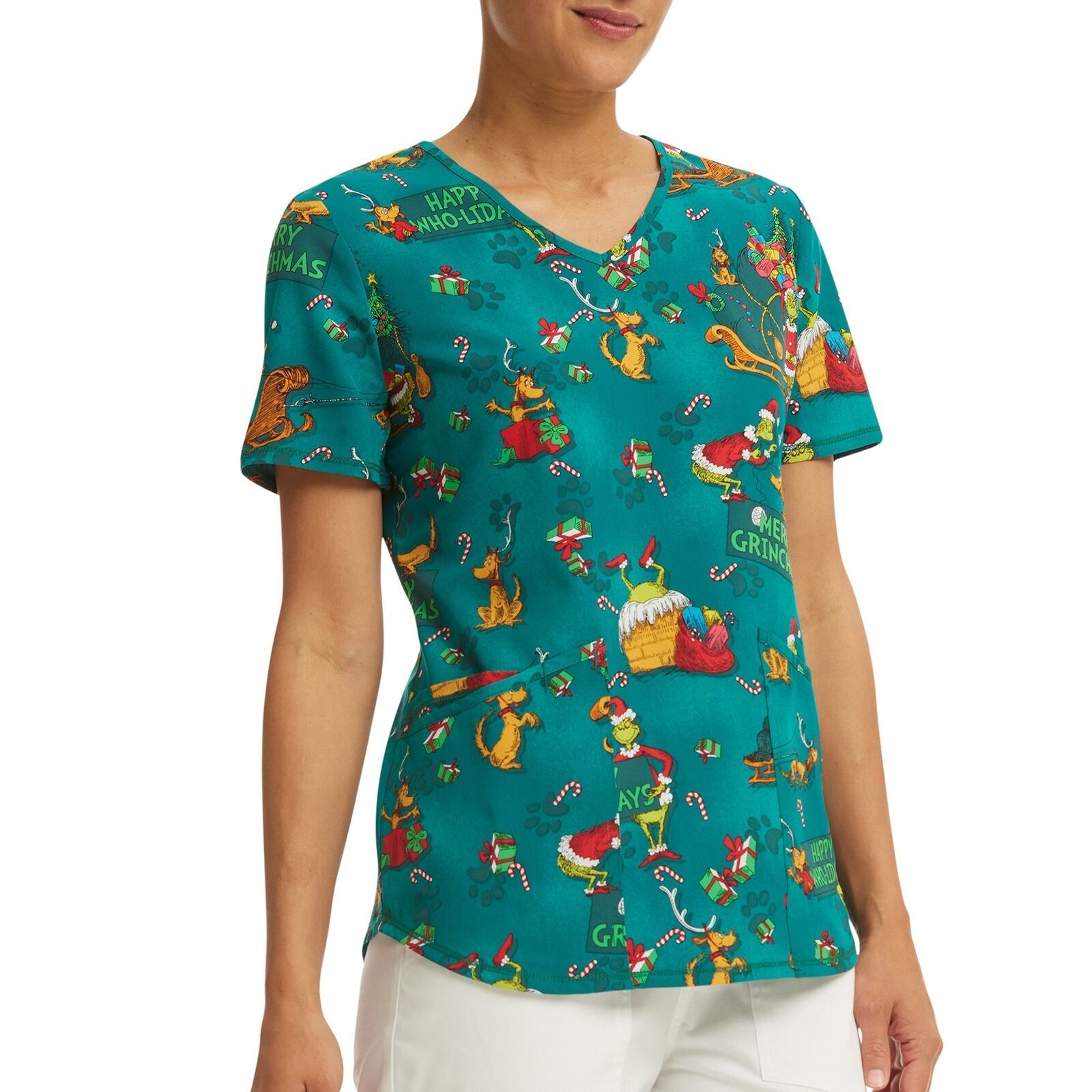 This holiday print top features beloved Dr. Seuss characters, The Grinch, and his dog, Max. The print design features classic scenes from the movie ?How the Grinch Stole Christmas? on a dark green ground. This scrub top includes three pockets for plenty of storage while the shirttail hem provides an updated look. Made of earth-friendly, ethical fabric with plenty of stretch. Officially licensed product.