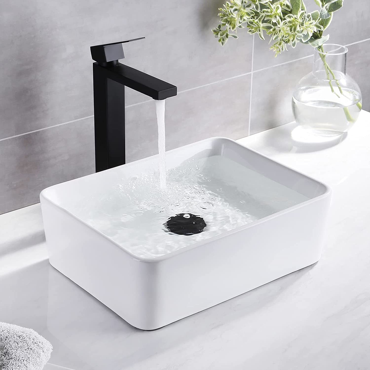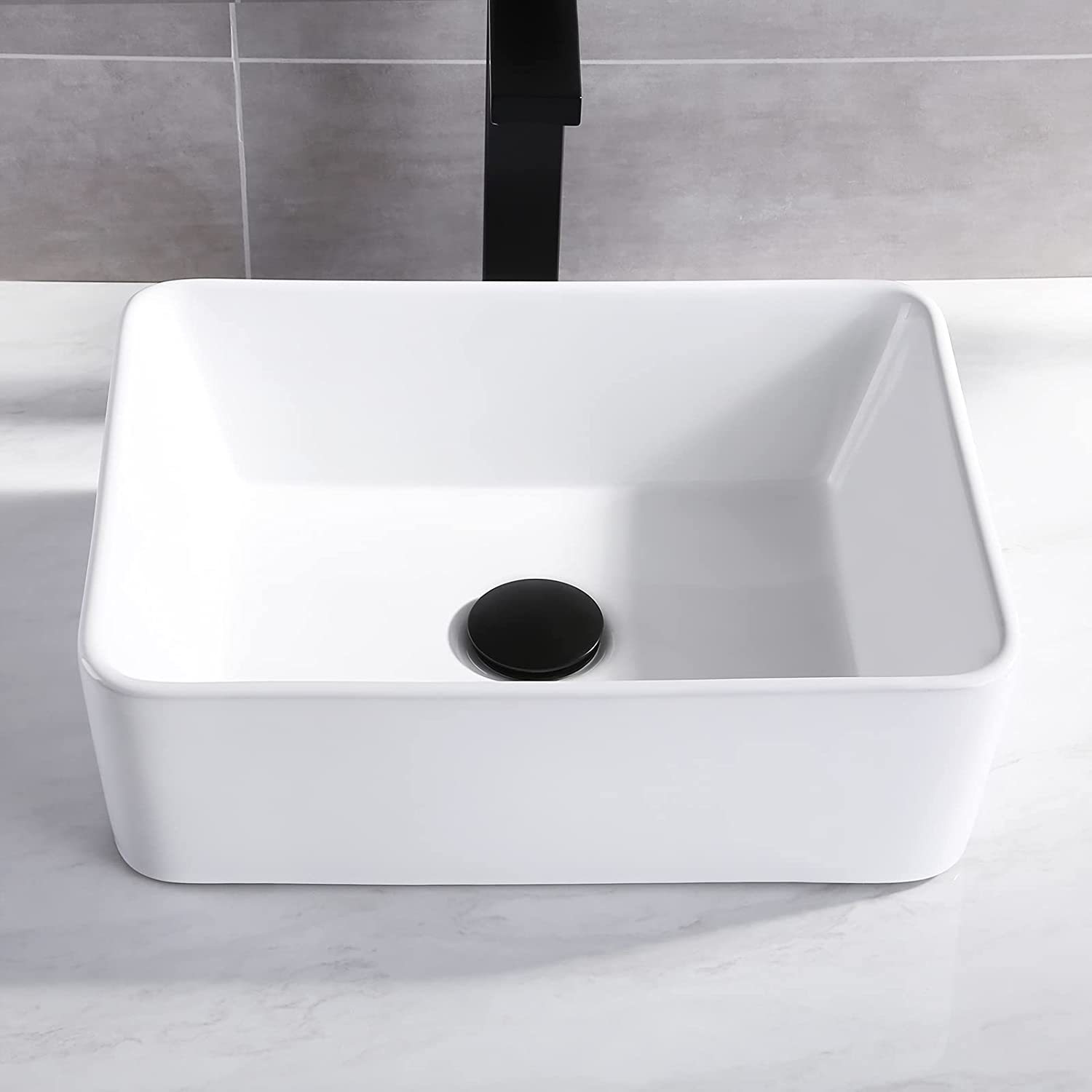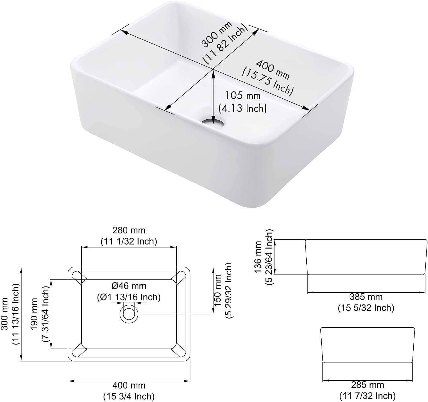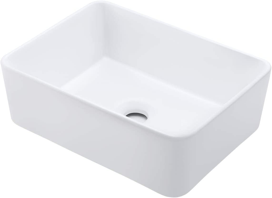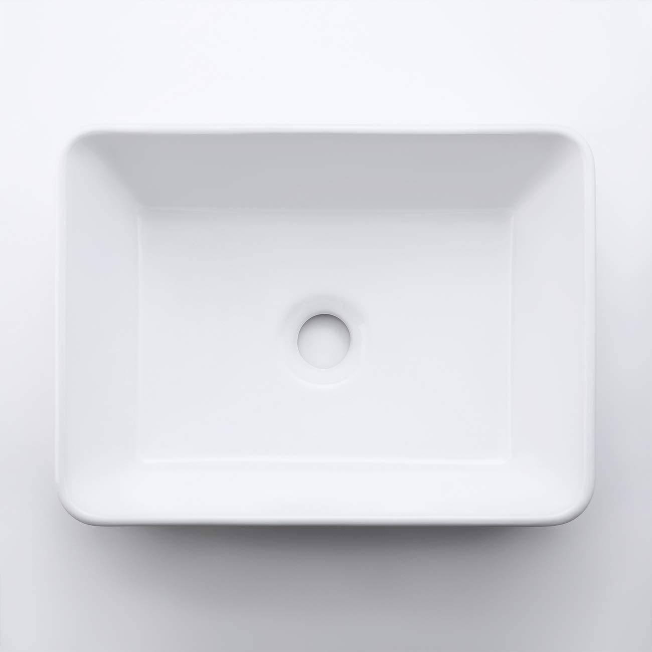 SQUARE VESSEL SINK: 15.75" (L) x 11.82" (W) x 5.35" (H)?400 x 300 x 136 mm?. Standard 1.81" drain opening.With a rectangle and sleek design, this bathroom sink can bring a modern and elegant touch to your bathroom. PREMIUM GLAZE: This sink has a smooth, non-porous surface with a baked-on glaze for added durability and a high-gloss finish. Simply wipe the sink surface with a damp cloth to keep it looking beautiful with minimal maintenance. DURABLE PORCELAIN CERAMIC: Crafted from high-grade ceramic, KES bathroom vanity sink is specially designed for impact-resistance. It features a stain and scratch-resistant surface to withstand everyday wear and maintain its luster, year after year. TOP MOUNT INSTALLATION: This square vessel sink is with no faucet hole, no overflow. Designed to work with both counter and wall-mounted vessel faucets. CUSHIONING PACKAGE: Sink is packed in a strong corrugated cardboard box with extra-thick foam on all sides, preventing shock and vibration. Please inspect the sink before installation to make sure it has not been cracked or chipped during transit.