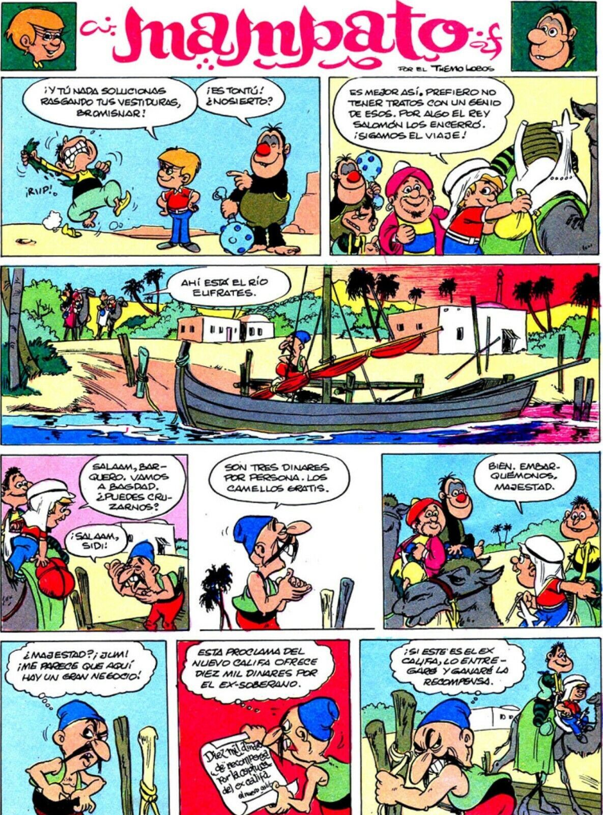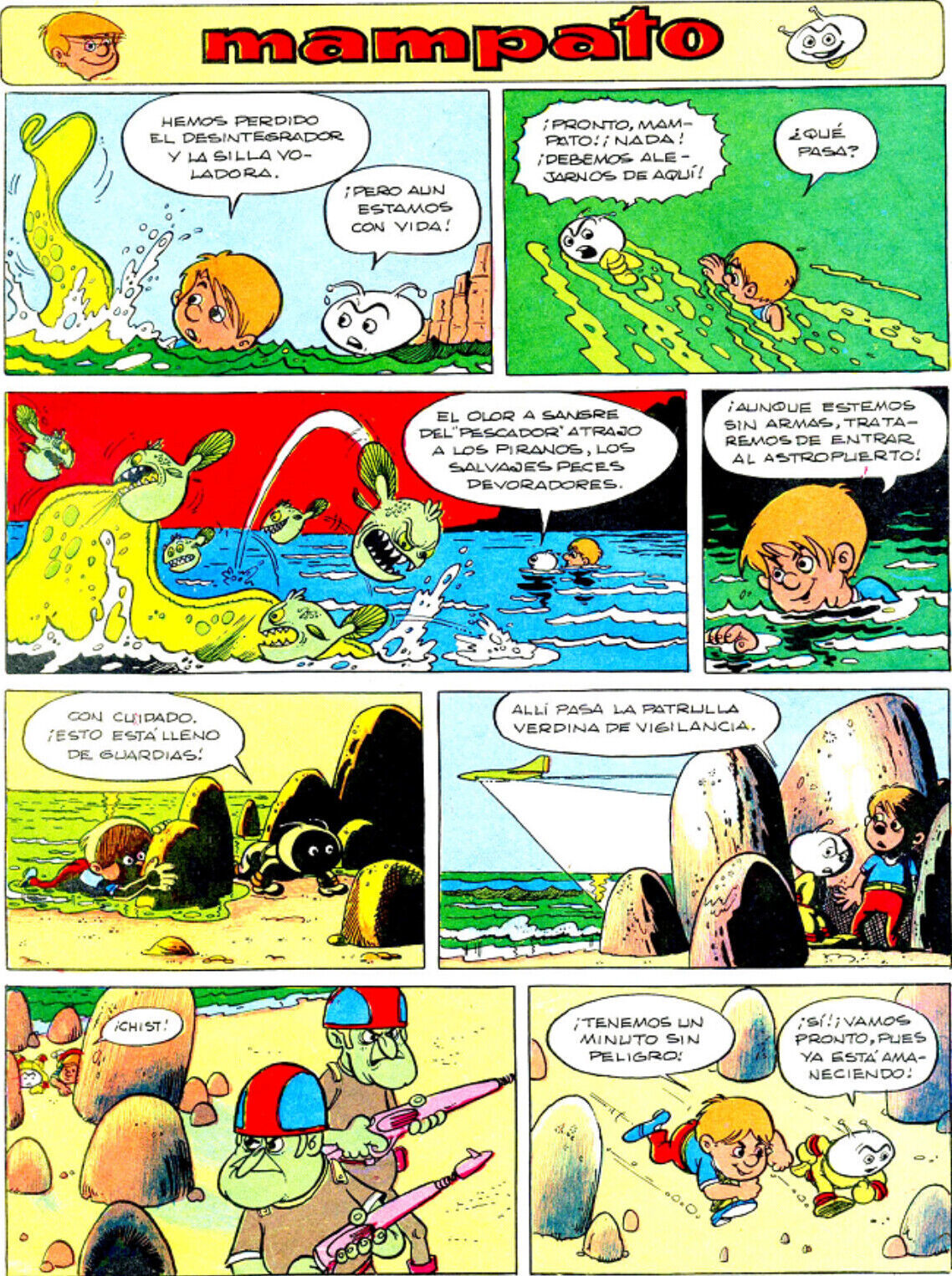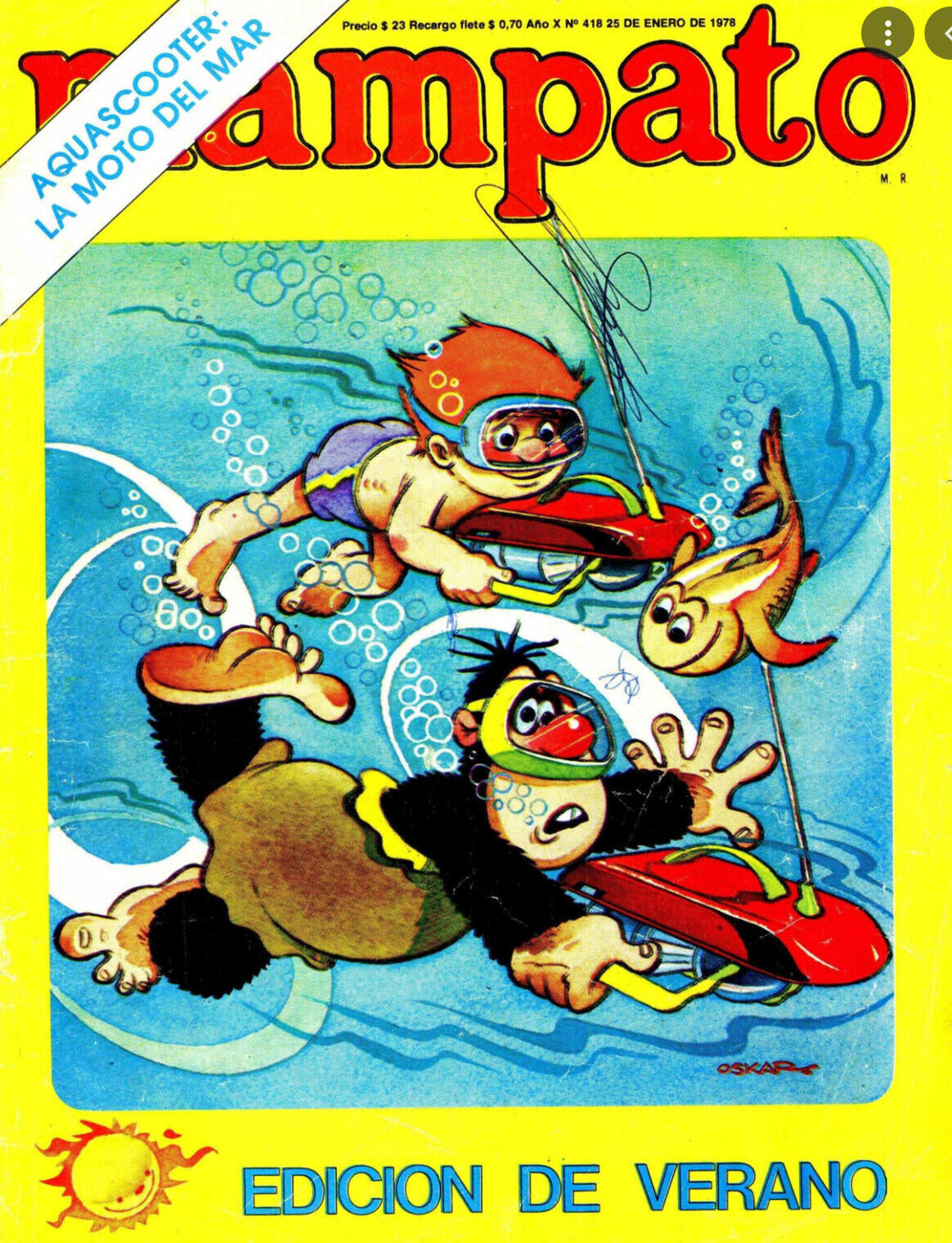 Mampato, precisamente, era el nombre del personaje de la caricatura central de la revista. Este era un niño de nueve años, aplicado e imaginativo, que gracias a su coraje e inquietud por el conocimiento conocio a un extraterrestre quien le regalo una herramienta para viajar por el tiempo: el cinto espacio temporal. De allí en adelante sus aventuras se transformaron en el referente de la revista. Aunque el creatore del personaggio di Oscar Vega, il desarrollo della storia nel testo e dibujos la compartio con Themo Lobos, de cuyas plumas nacieron personaggi come Ogú, Xse, Rena y Colofon. L'anno 1996 estas historietas fueron publicadas por Editorial Dolmen, en formato libro de comic y con gran distribuzione. Las aventuras ha incluso llegaron al cine cuando en 2002 se exhibio, con gran exito d