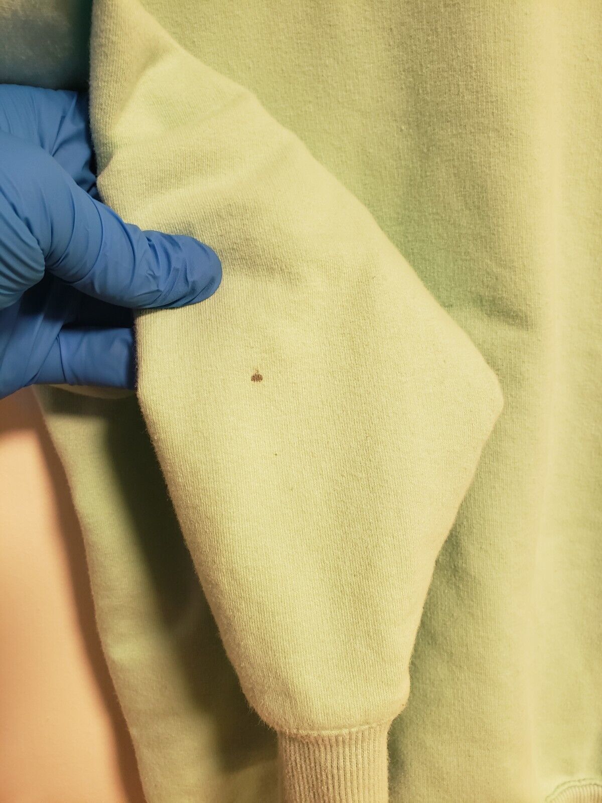 Good condition. We did find two spots on this item. See last two pics. One on sleeve and one on shoulder. Priced accordingly.