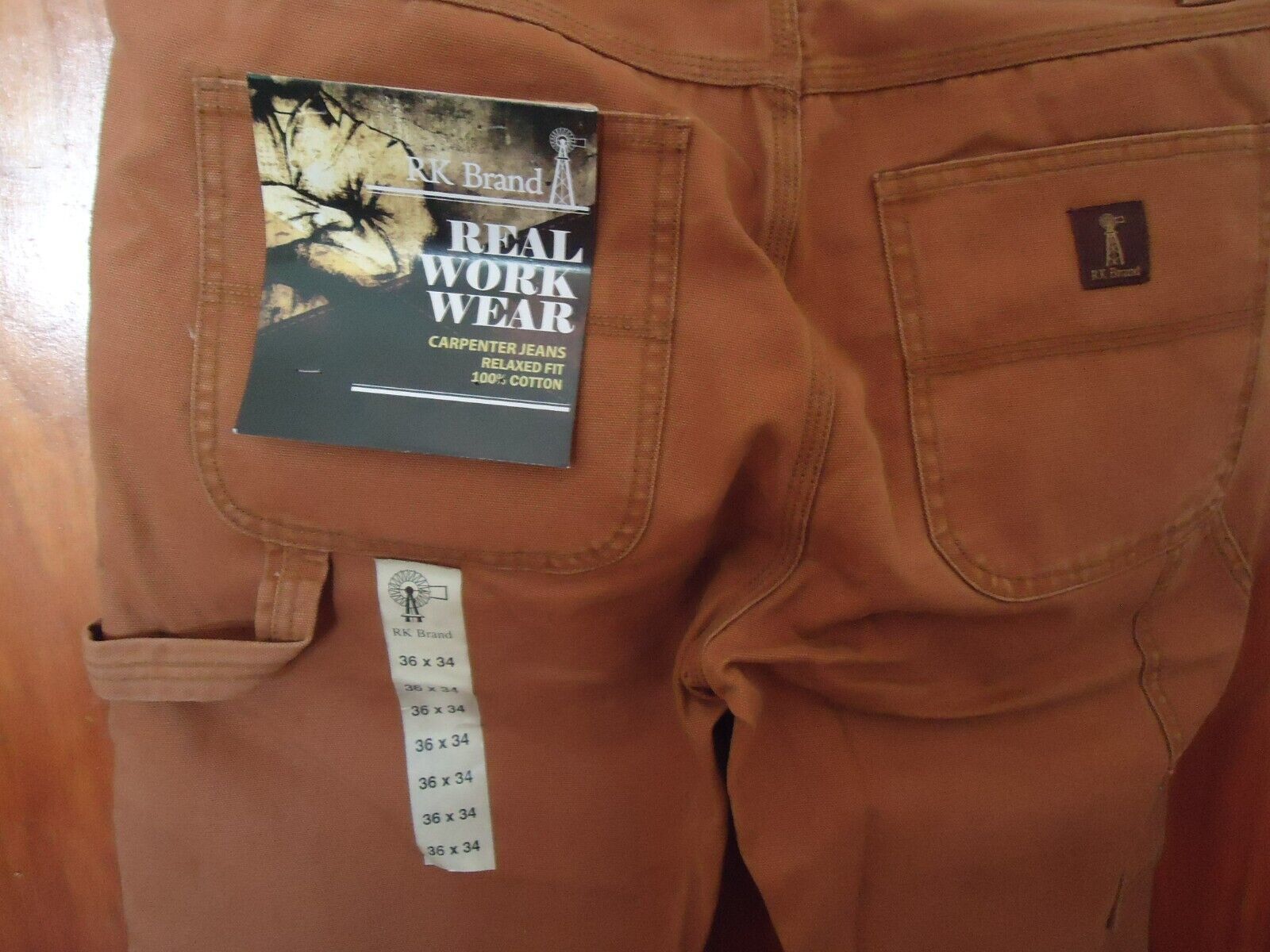 Here is a pair of " NWT " RK Brand Size 36x34 Brown/Tan Relaxed Fit Carpenter Jeans " GREAT GIFT ITEM ".The pics do not do this item(s) justice.If you have any concerns or questions about this item(s) please ask before bidding / purchasing because this item(s) is being SOLD AS IS.Thank You.-(CL13)