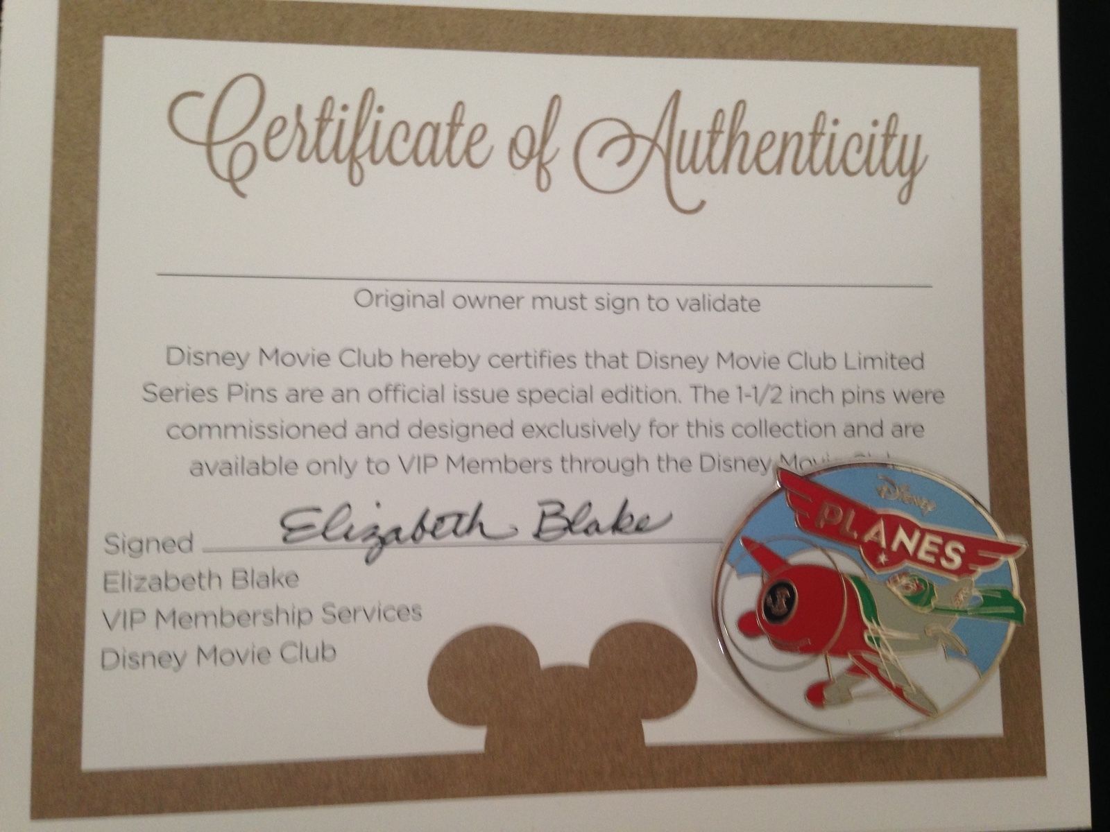 Planes Disney VIP Movie Club Pin With Certificate Of Authenticity