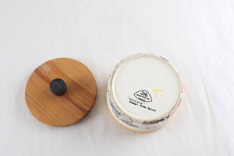 Anita Nylund designed the "Our little town" series during the 1950s for Jie-Keramik in Gantofta outside Helsingborg. The flintware series contained 17 jars, a pepper shaker and a sugar sprinkler. The objects had rounded shapes, colorful small town motifs and wooden lids. The motifs were taken from Anita's hometown of Lidkoping, where her father Gunnar was a well-known artistic director at the Rorstrand factory. Seven of the cans were made for the English-language market. The last jar - "Melles marmalade" - was added as late as 1990. Our small town, with its typical warm-hearted expression, has become a classic among many retro collectors.