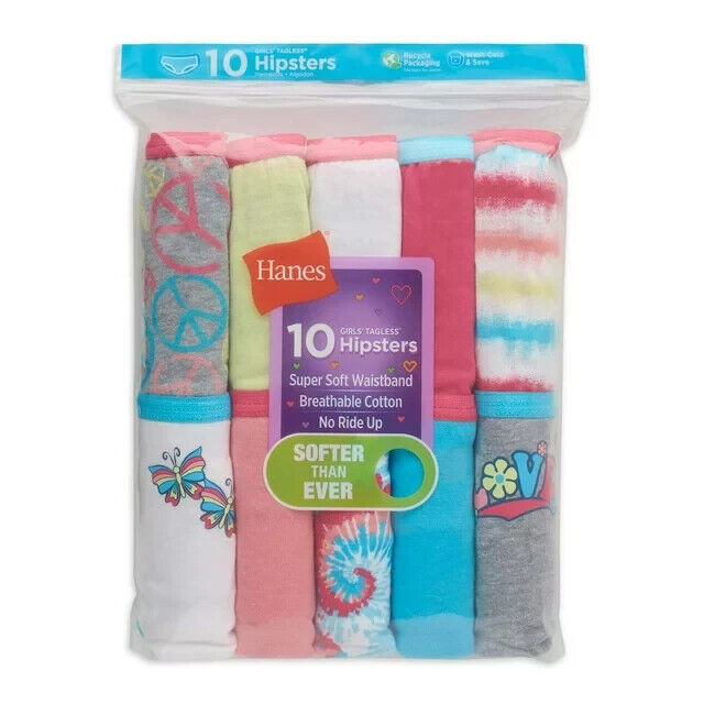 Comfort, fit and fun come together in the Hanes Tagless Girls' Hipsters. Soft to the touch, the breathable cotton fabric is softer than ever, too! Plus, the super soft waistband will not ravel, for added comfort wash after wash. The no ride up guarantee keeps panties from misbehaving for stay-in-place confidence. Hipster styling fits comfortably at the hip for no show under clothes. And the Tagless label means no itchy, pesky tags. Available in a 10-pack, these hipsters come in fun colors and prints. So if you're looking for comfort, fit, and fun offered at an irresistible value, then look no further than the Hanes Tagless Girls' Hipsters.