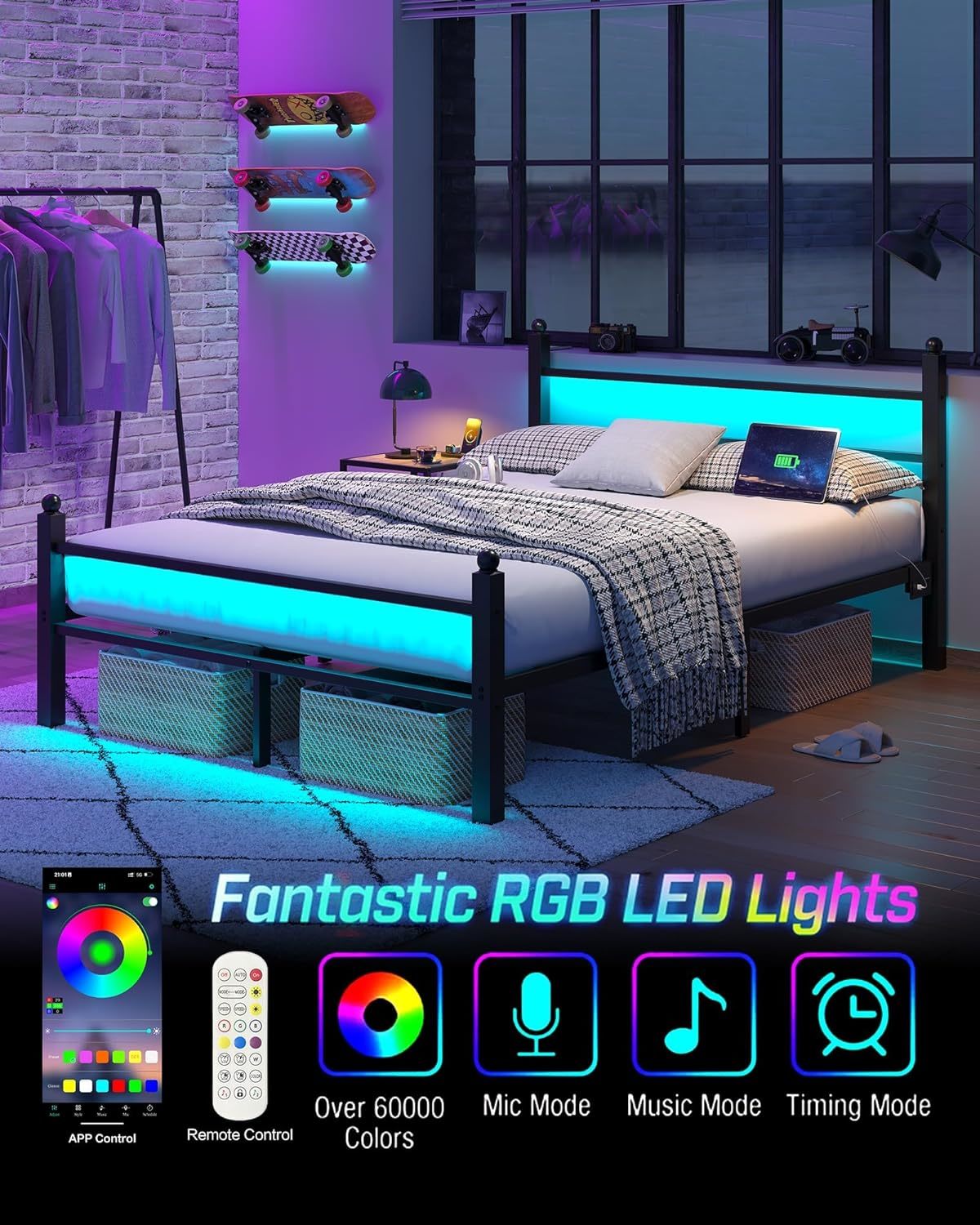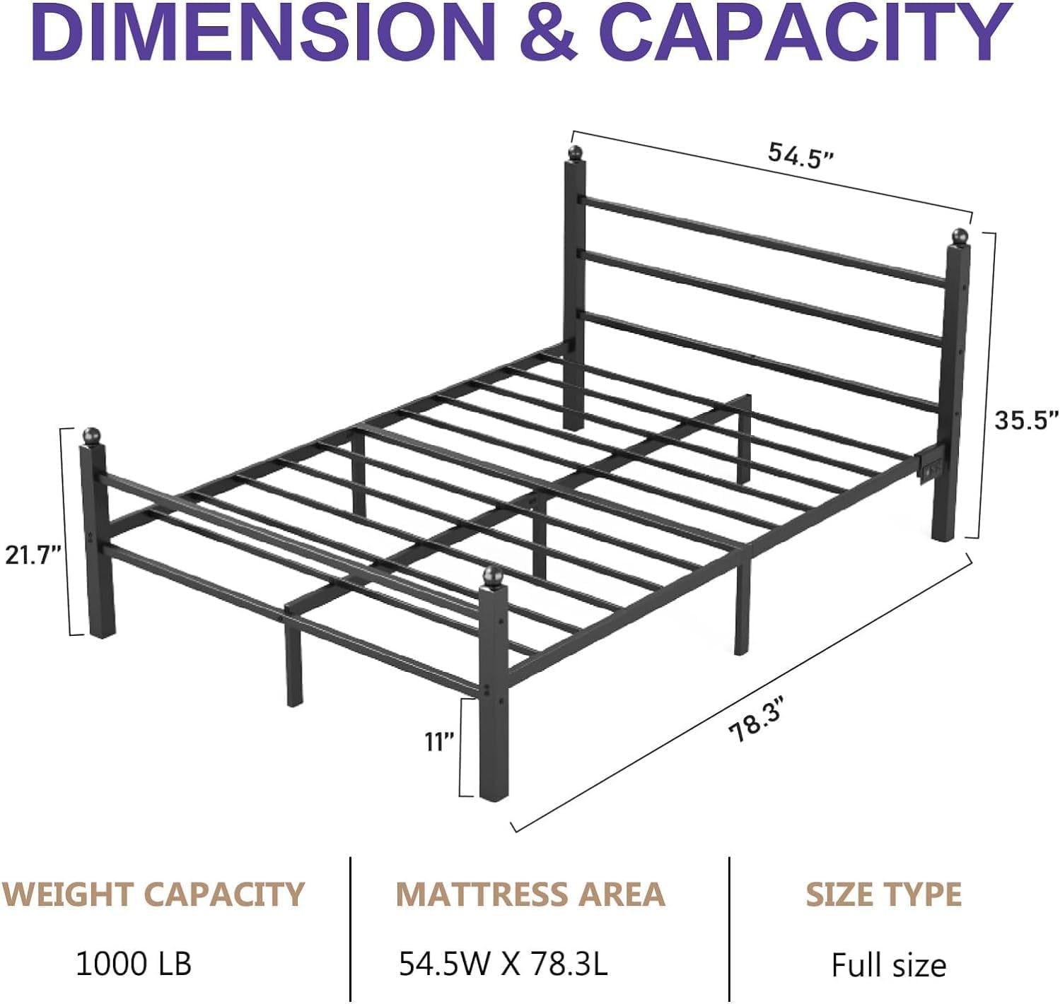 HEADBOARD DESIGN: Our bed frame boasts a taller headboard, offering enhanced head protection and creating a cozy sitting area. you can comfortably prop soft pillows behind your back, enjoy lazy TV-watching moments. SAFE SLEEP: Our robust steel slat support and center legs that keep your mattress securely in place. Say goodbye to annoying bed frame squeaks as you shift during the night. Our platform bed frame guarantees a comfortable and uninterrupted sleep. STURDY CONSTRUCTION: The bed frame is crafted from high-quality metal material, and the reinforced legs prevent the structure from twisting with a high load capacity of up to 1200lb, offering sufficient firmness and stability free of wobbling worry. AMPLE STORAGE: Our large bed frame provides generous under-bed storage, keeping your bedroom clutter-free and allowing easy cleaning. Arrange it as per your needs to store extra items efficiently, ensuring a well-organized space. EASY ASSEMBLY: Our bed frame is meticulously engineered for noise-free construction, featuring fewer screws and quick lock-on installation. Each part of the bed is labeled with corresponding numbers, making it exceptionally easy to follow the instructions and complete the assembly with confidence. Enjoy a hassle-free setup and get ready to experience the comfort of your new bed
