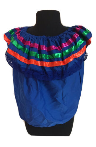 Blue Women Size M Off-Shoulder Ruffle Top W/Lace Ribbon Folkloric Fiesta Dance B