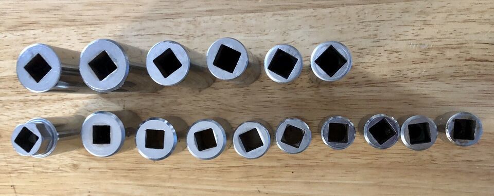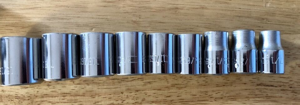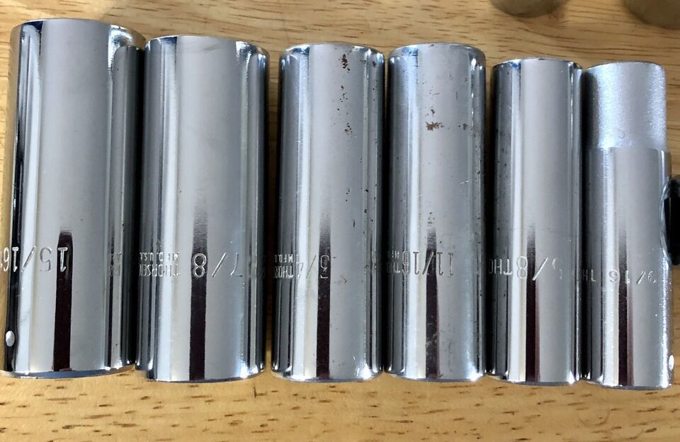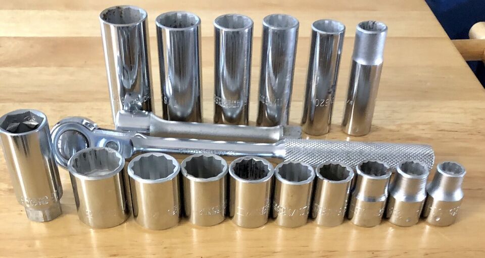 Items included in this set are a 10” ratchet #77, 5” extension #53, standard sockets 7//16” 1/2” 9/16” 5/8” 11/16” 3/4” 13/16” 7/8” 15/16”. Deep sockets 9/16” 5/8” 11/16” 3/4” 7/8” 15/16” and 13/16” spark plug socket. Look at pictures good a few sockets have minor cosmetic issues.