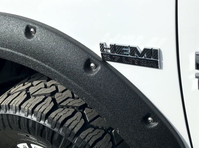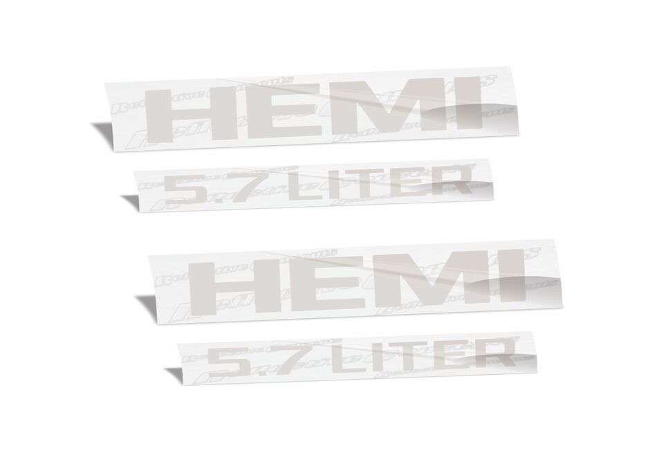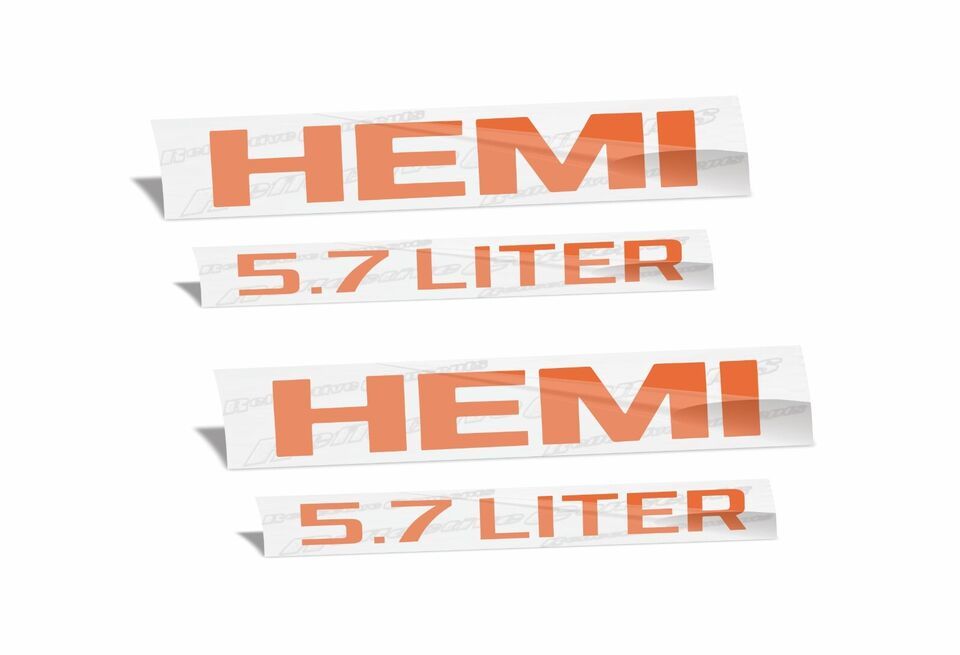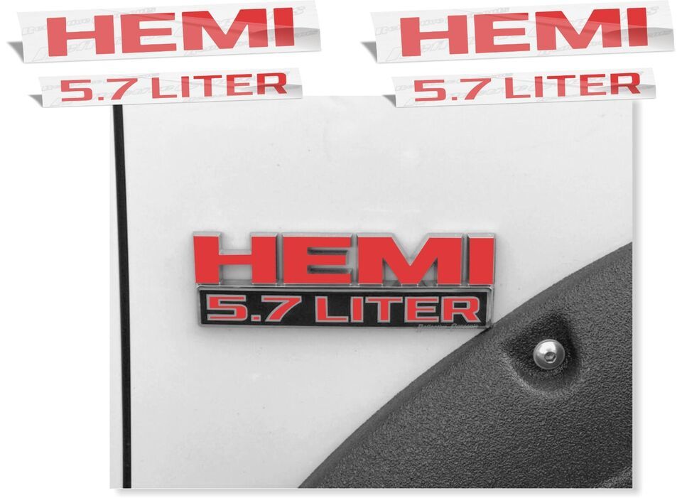 Decals (stickers) designed to overlay the front face of the HEMI and 5.7 LITER sections of the factory fender emblems.