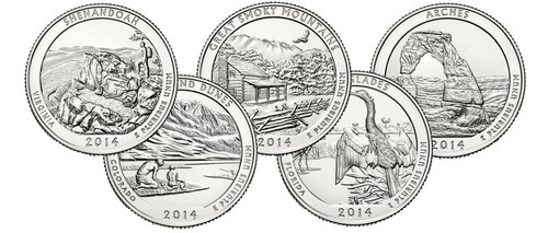 2014 America The Beautiful 24K GOLD PLATED Quarters Parks 5-Coin Set w/Capsules