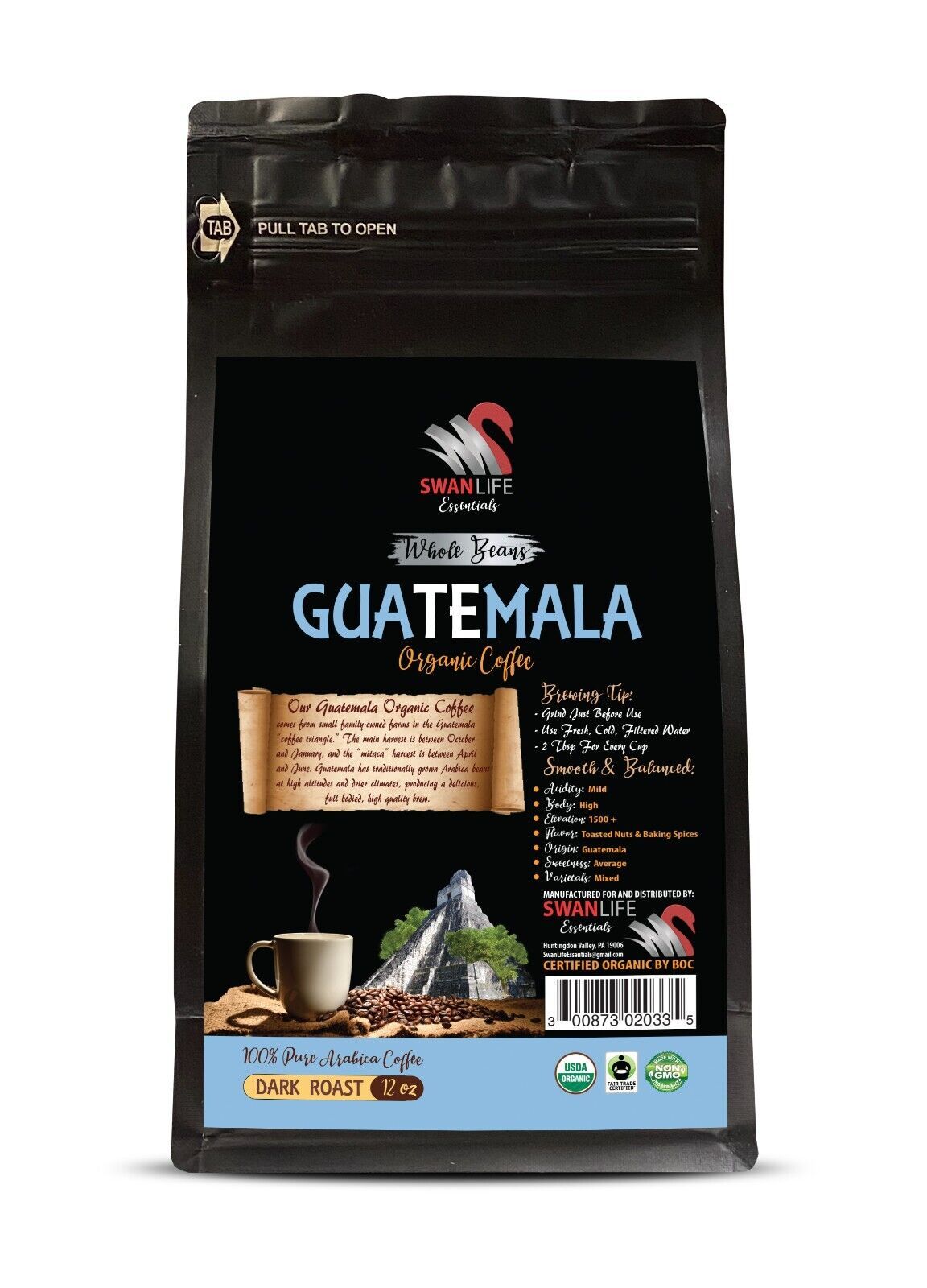 arabica coffee - dark roast - GUATEMALA COFFEE ORGANIC - whole beans - 1 Bag