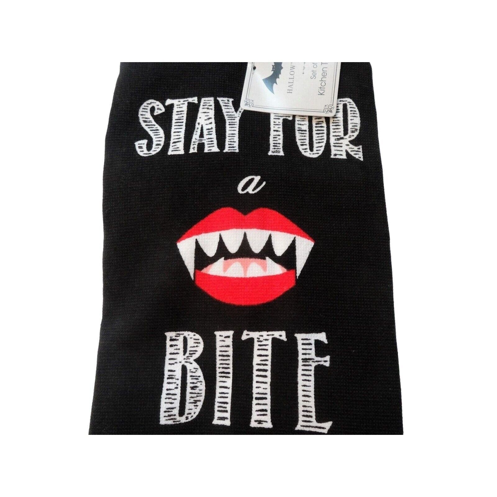 Hallow's Eve STAY FOR A BITE Kitchen Towels Thick Cotton Black White Holiday 2pc