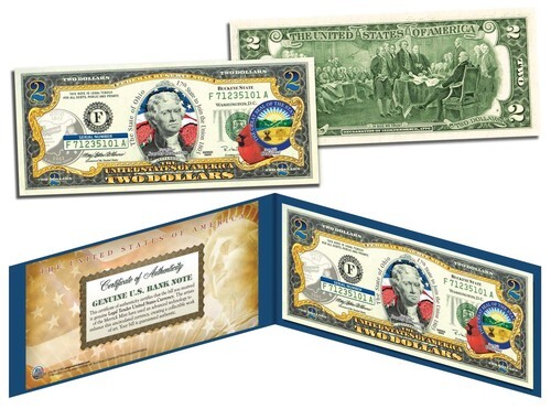 Celebrate America with the popularity of the statehood series with these colorized $2 bills. Each bill features the state's name, bird, flower, nickname, emblem, year of admission, and State Quarter graphic. The State Quarter featured on the bill is an actual watermark security feature?the first of its kind! Americans from all over the country are rushing to obtain the new ?Statehood? Genuine Two Dollar bills, while they last. The coveted U.S. Government $2 bill is rarely seen in circulation and only banks and currency dealers may obtain special uncirculated bills directly from the Federal Reserve Bank. Now for the first time ever these enhanced uncirculated full color two dollar bills are available exclusively from this limited time offer. Two dollar bills are among the most beautiful of all U.S. circulating currency and now the rarely circulated $2 bill is even rarer with exclusive overlay of our beautiful States. Each Bill comes with a full-Color Certificate of Authenticity handsomely displayed in a Special Gold Foil Museum-Quality Folio. Don?t Miss Your Chance to Order?.Very Limited Quantity Available!