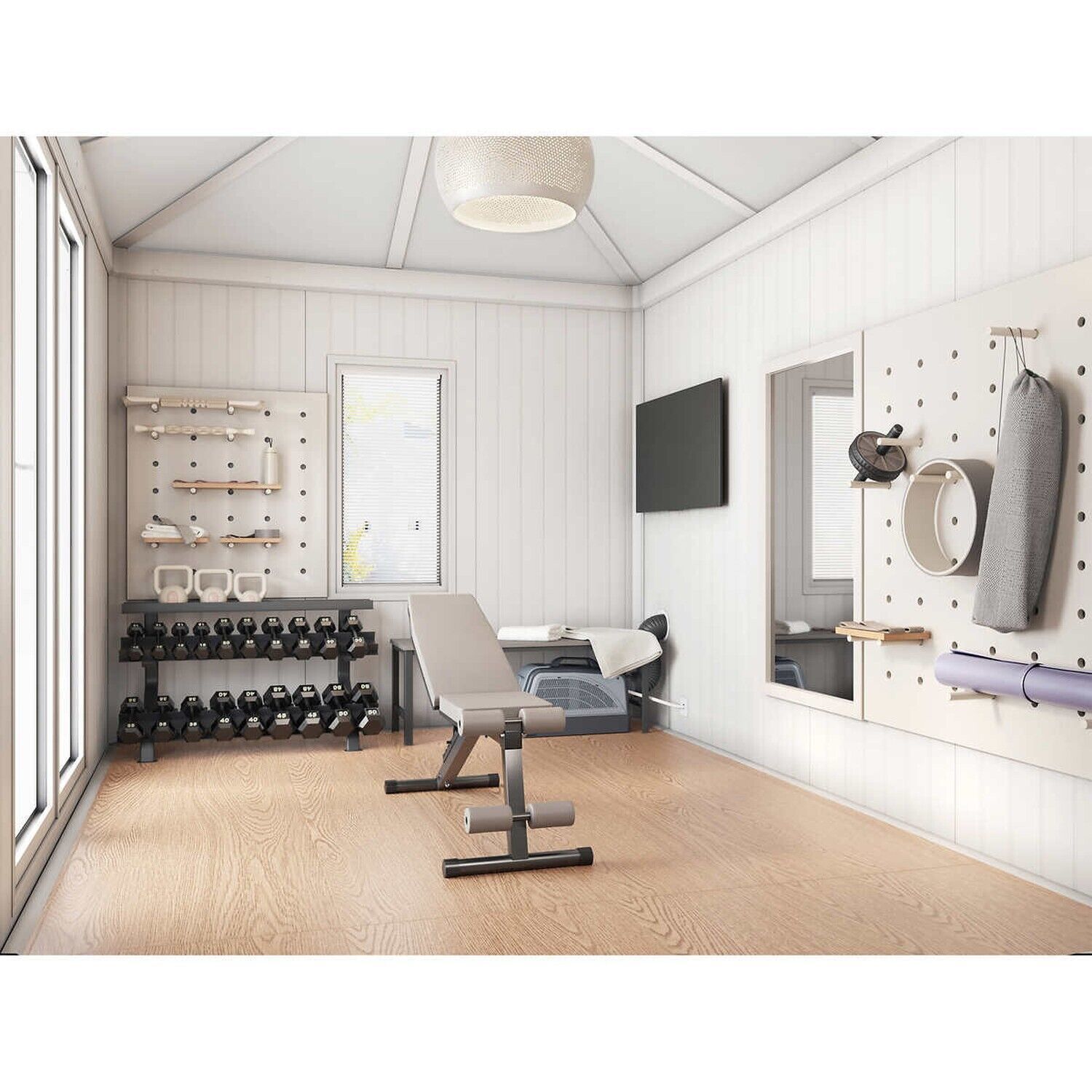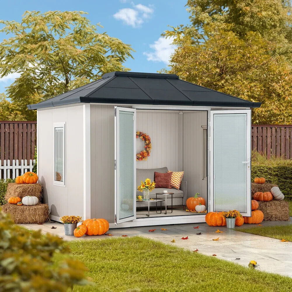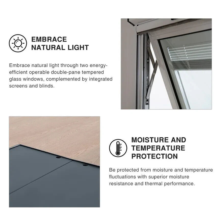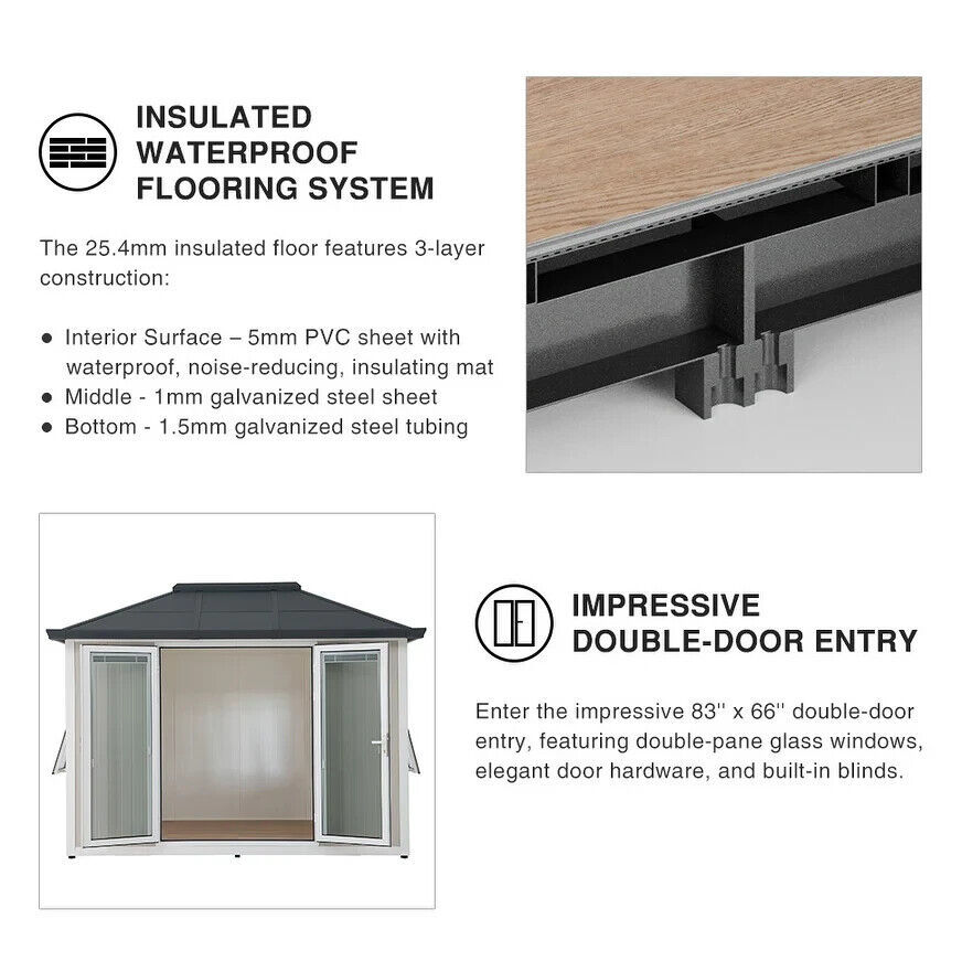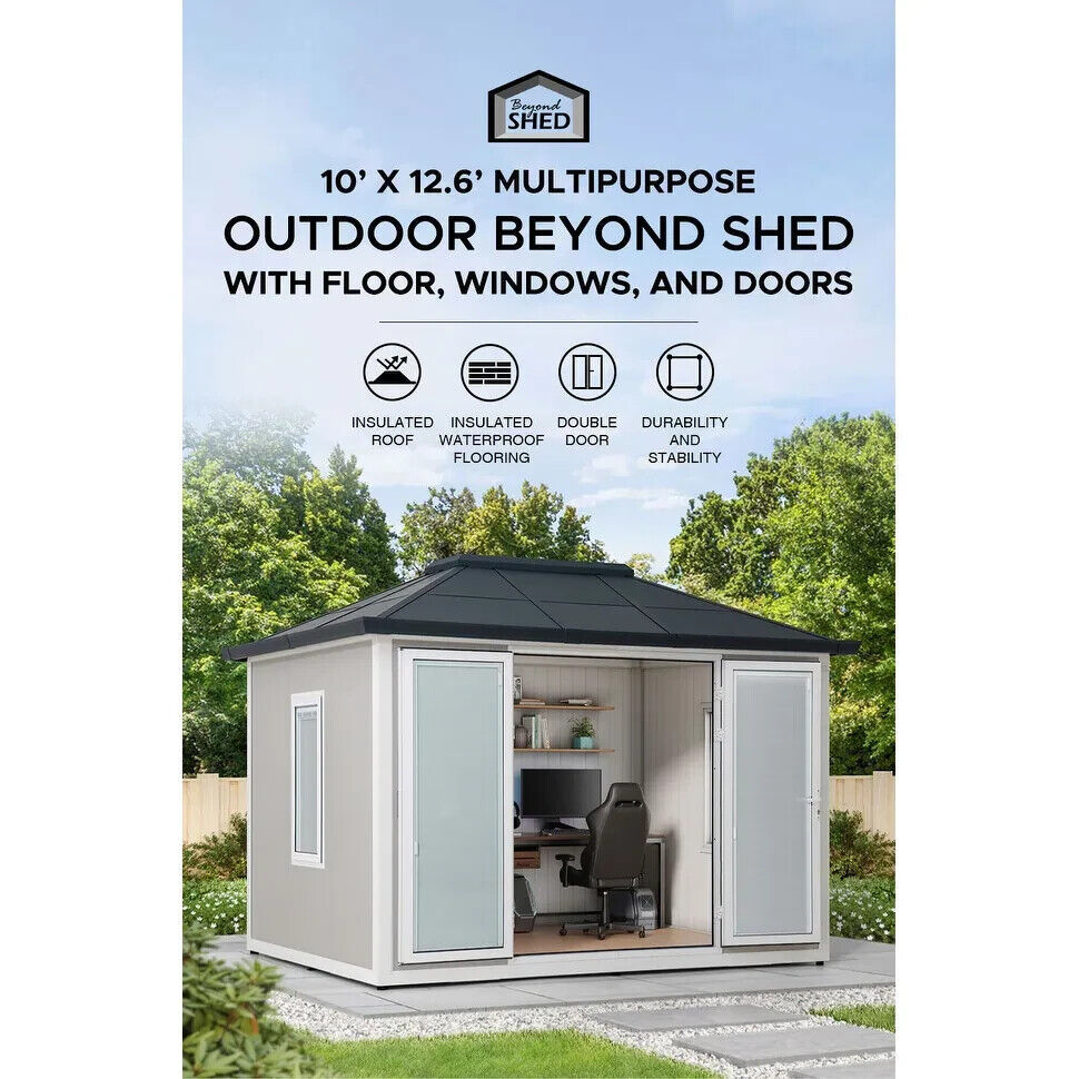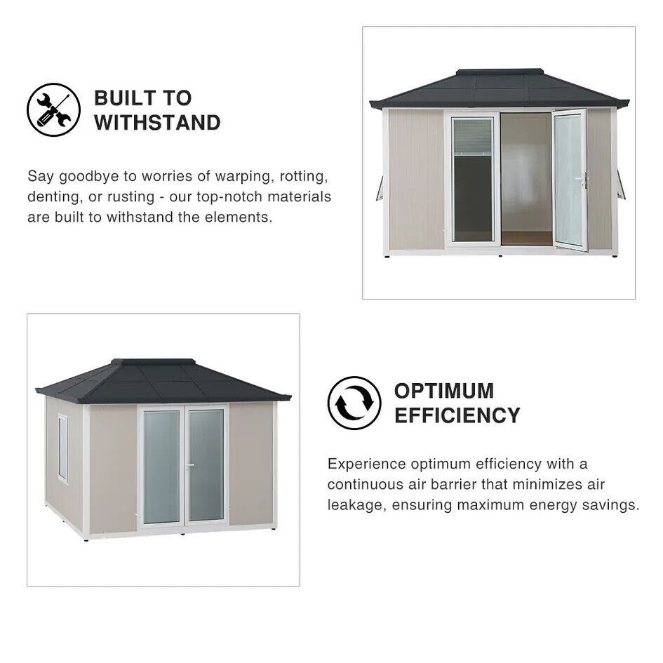 Timeless elegance and lasting quality...transform your backyard into your very own sanctuary with the Esquire Beyond Shed? from Sunjoy. This innovative and customizable outdoor studio is built to expand your home's functional space. Whether you're looking for a garden shed, backyard office, 'she' shed, home fitness studio, or a multipurpose room, the Beyond Shed? has got you covered. Crafted with meticulous attention to detail, this generous 10' x 12.6' shed features superior craftsmanship and durability. With insulated walls, doors, windows, roof, and floor, you'll experience comfort and the peace of mind that comes with quality construction year-round. The modular and interchangeable wall and window panels offer maximum flexibility and customization, while the premium insulated roof system provides exceptional moisture protection and thermal resistance. Assembly is a breeze with the modular panel design and fully panelized wall sections. NO CAULKING OR PAINT REQUIRED!