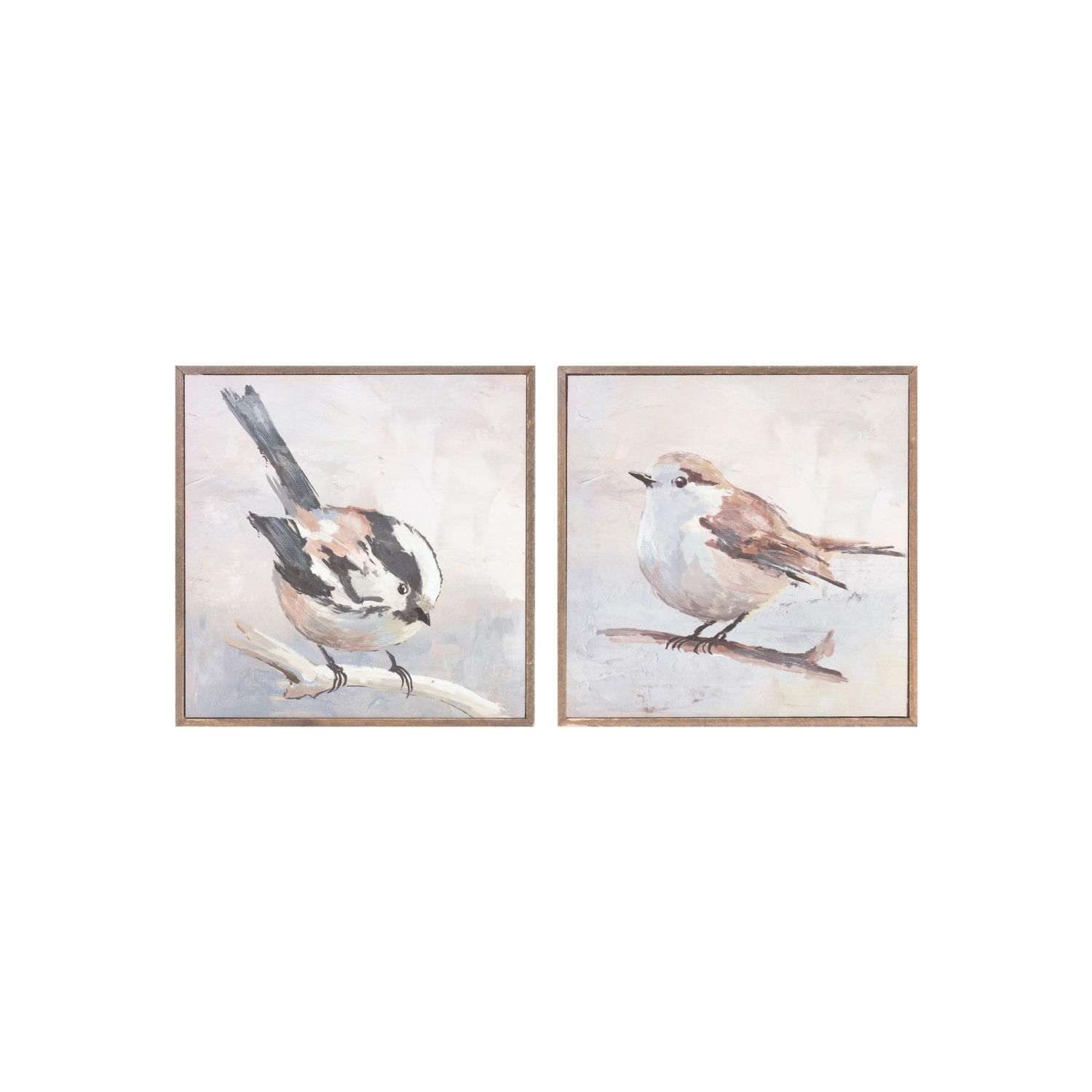 Elevate your home decor with the Framed Bird Canvas Block Set. This beautifully crafted set features delicate bird artwork in soft brown and grey tones, complemented by branch accents that create a serene, nature-inspired look. Perfect for any room, whether it s your living room, bedroom, or office, these 10" square pieces bring a vibrant yet calming touch to your space. Made from high-quality wood and canvas, this set is designed to last and brighten your surroundings with a cheerful, spring-like ambiance. Transform your walls with this timeless piece of art and bring the beauty of nature indoors! Sold in a set of two assorted designs to create a balanced and memorable display in your home.