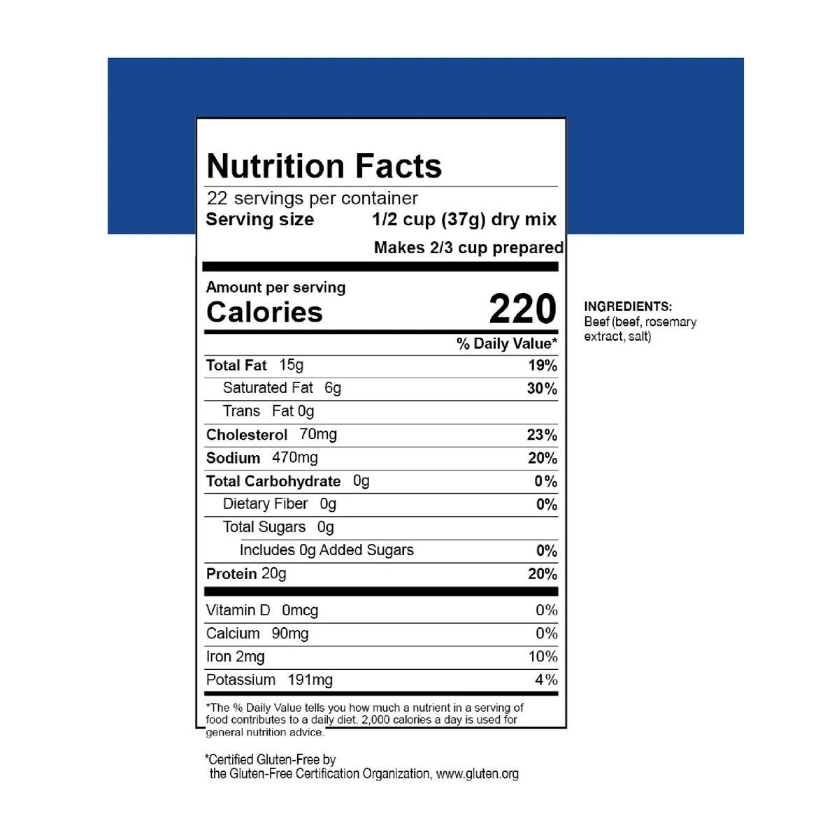 Simply add hot water, and in about 8-10 minutes you?ll have a delicious meal that will feed the whole family! Made with all natural beef, it is an excellent source of protein that can be used creatively when making your favorite recipes from beef like tacos, chili, or sloppy Joes.