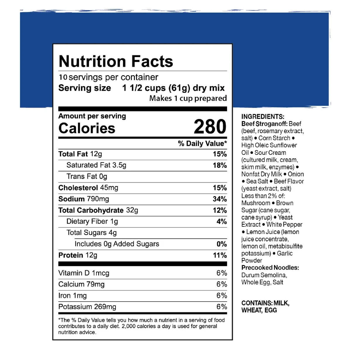 Six #10 Cans for a total of 60 servings Tender, all natural beef, savory mushrooms, and onions with noodles in a rich sour cream sauce. No artificial flavors or colors Quick prep ? just add water and eat in less than 10 minutes Net Weight per can: 21.7 oz. (1.36 lbs.) Servings per Can: 10 Serving Size per Can: 1 cup Calories per Can: 2,800 Up to 30 years shelf life