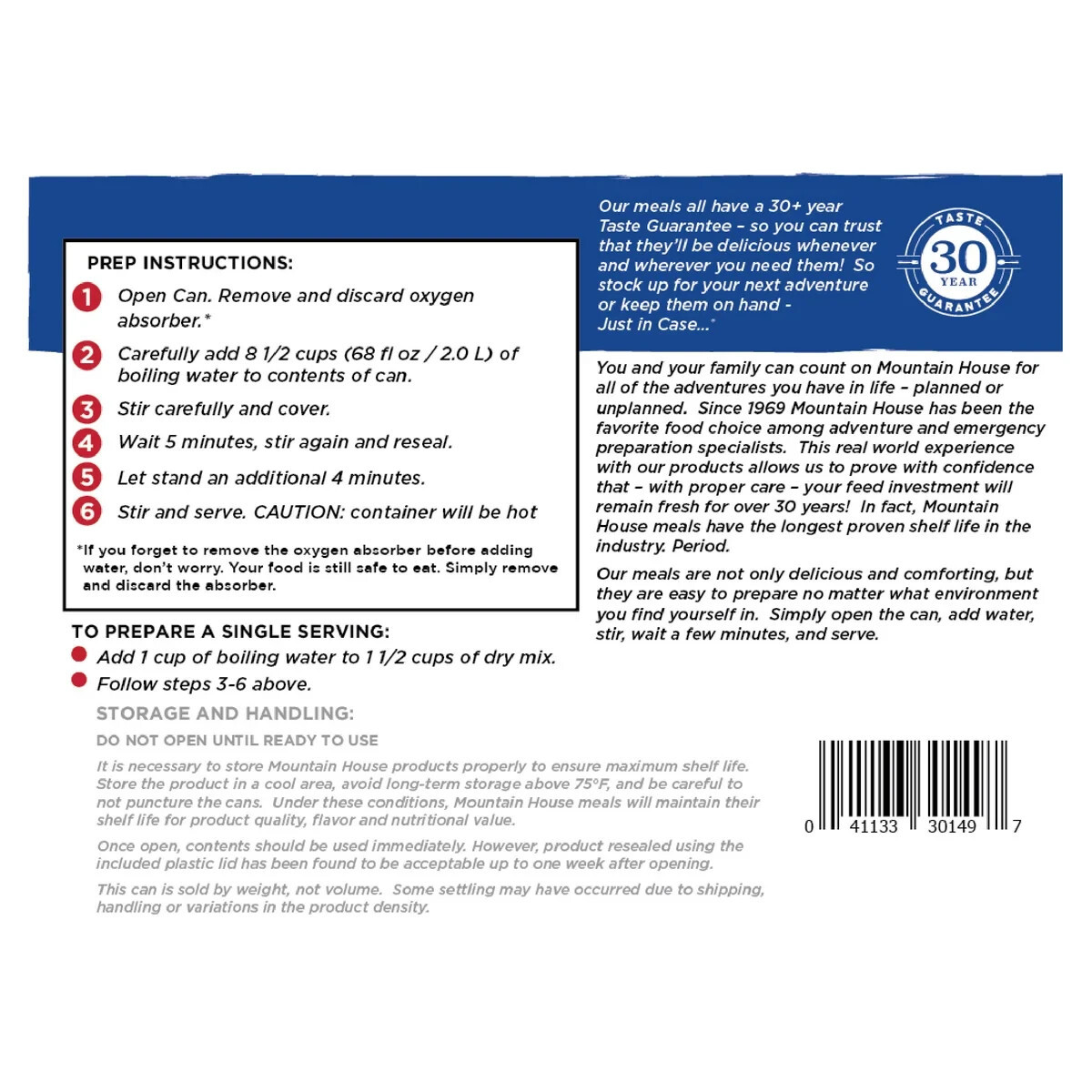For over 50 years, Mountain House has been the trusted gold standard for camping and emergency food in the industry. Mountain House meals are unmatched in quality, ease of preparation, shelf life, and unbelievable taste. Just add water directly to the can and enjoy a delicious meal in less than 10 minutes.