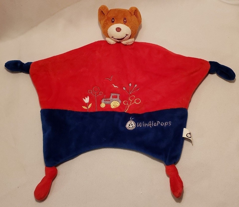 Teddy Bear Tractor Lovey Knot Cornered Security Blanket Red Blue Baby Winklepops