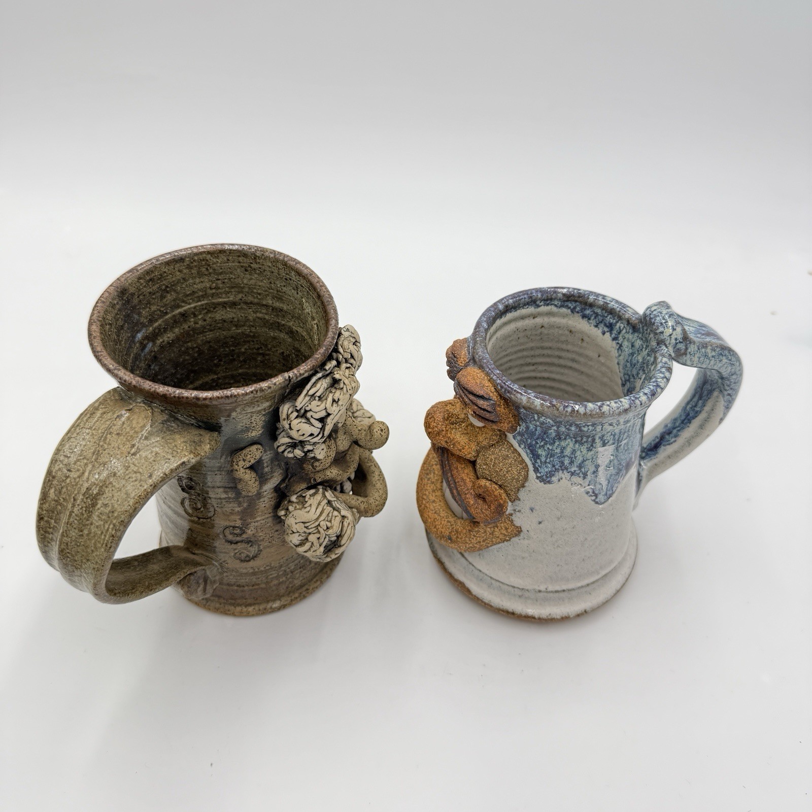 Pair Ugly Face Studio Art Pottery Drip 5” Blue Gray Coffee Mug Stoneware Handmad