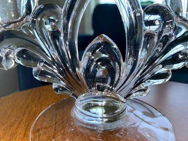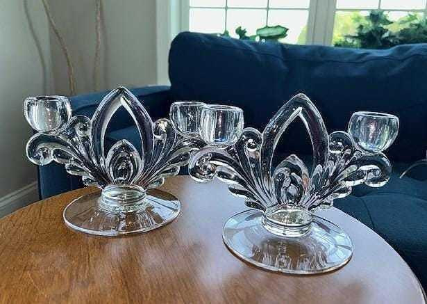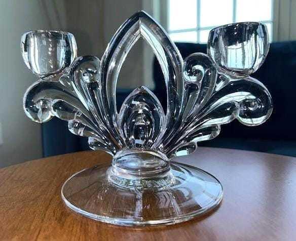 This set of TWO 1940's ART DECO style Dual Arm Glass Candelabras are a unique and stunning addition to any place in your home.