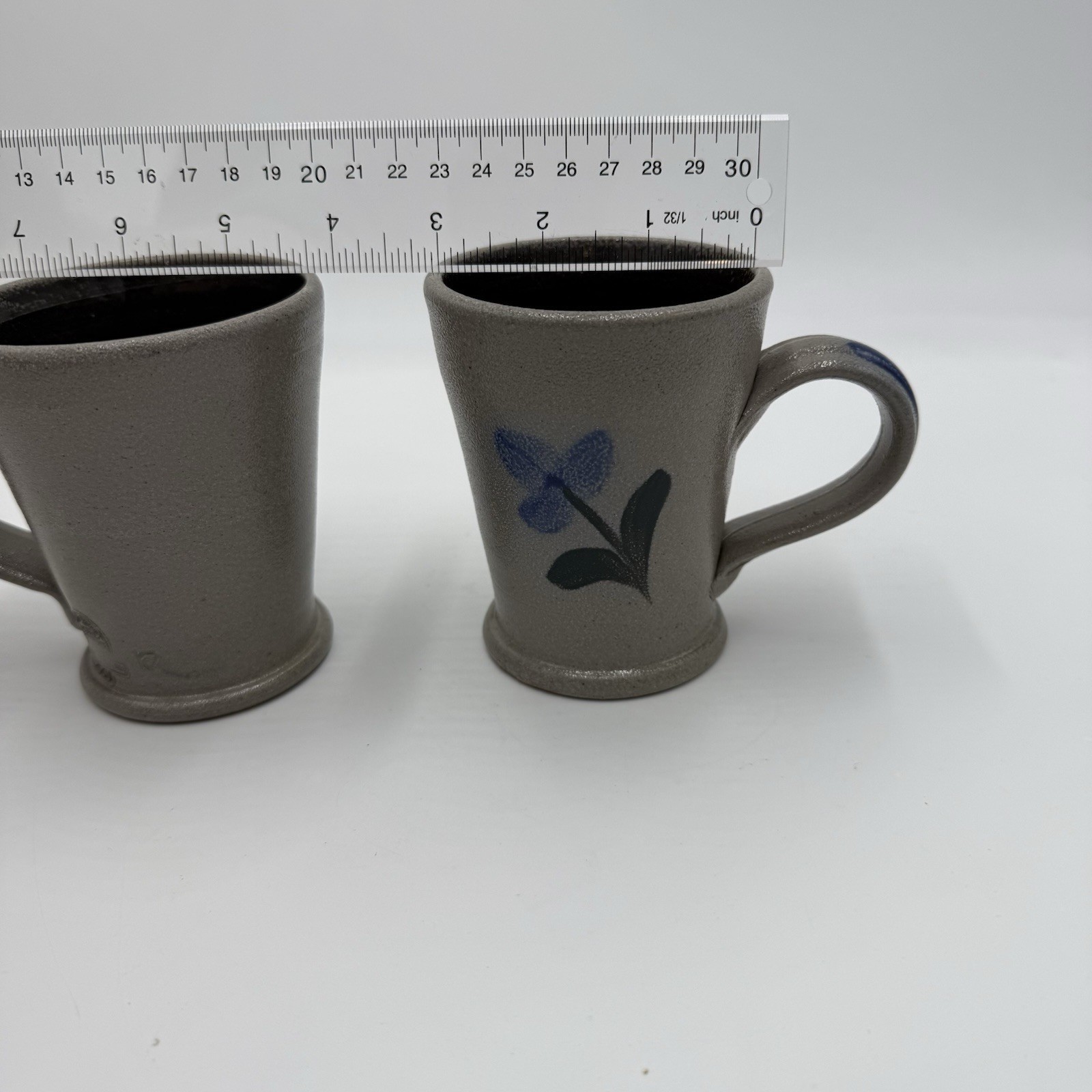 The Rowe Pottery Works Salt Glazed Blue Flower Mug is a vintage stoneware coffee or tea cup handmade in Wisconsin in 2001. This two-piece round mug features a blue flower pattern and a unique salt glaze finish, adding a touch of artistry to your drinkware collection. Standing at 4 inches tall, this original piece from the 1990s is perfect for all occasions and adds a rustic charm to your decor.