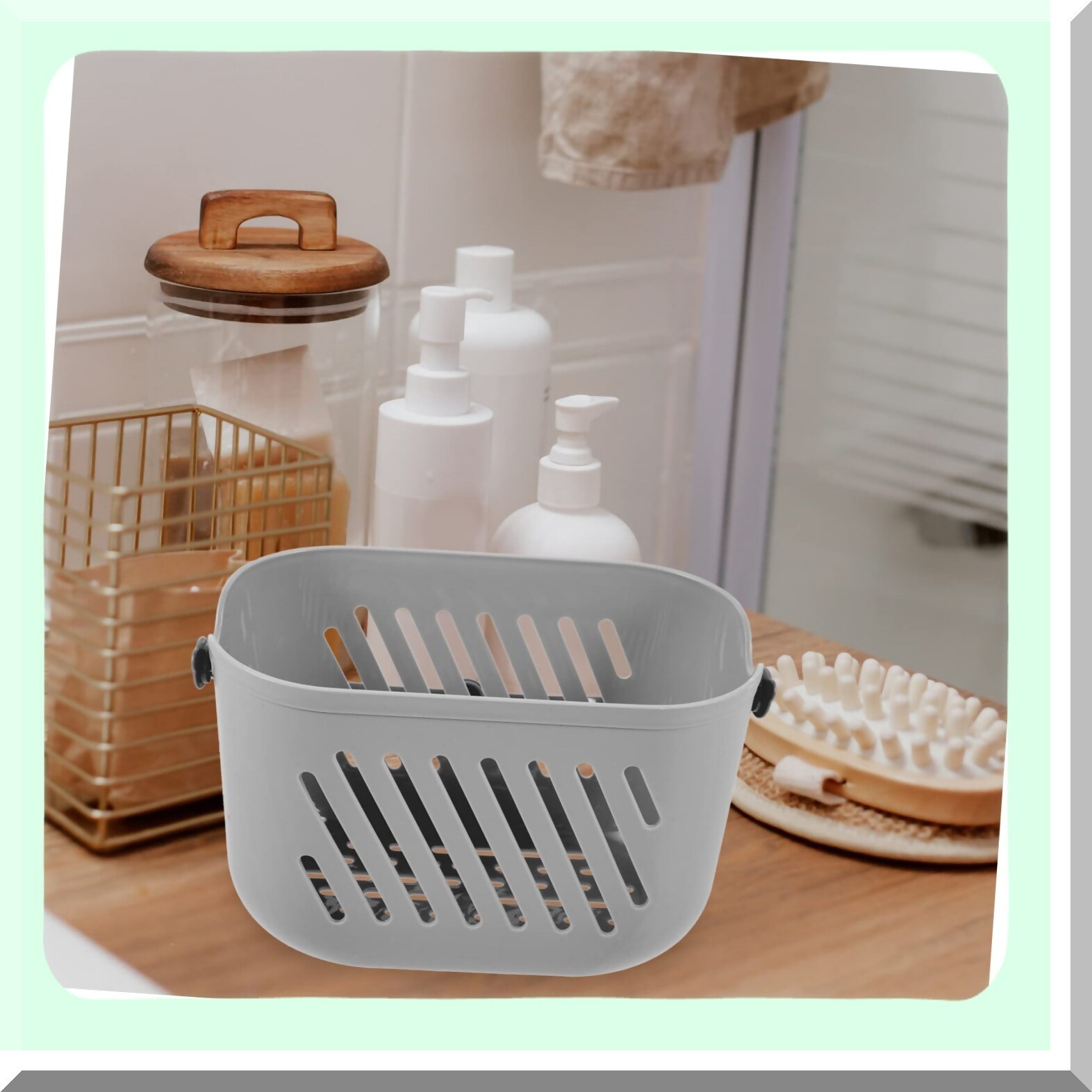 This grey plastic shower basket measures 32.00 x 21.50 x 12.50 cm, offering a practical storage solution for bathrooms. Made from durable, smooth-surfaced plastic, it is safe to use and prevents scratches. The basket features bottom holes that allow water to drain freely, helping items dry naturally. Its versatile design makes it suitable for storing cosmetics, bathroom toiletries, cleaning supplies, towels, and other small items. The hanging handle with a hook allows for easy suspension and portability, making it convenient to carry and hang. The sturdy construction ensures long-lasting use, and the smooth surface prevents hand injuries. Ideal for organizing various spaces, this basket can be used in bathrooms, kitchens, bedrooms, living rooms, gardens, and more. Its lightweight and durable design make it a reliable choice for keeping your essentials tidy and accessible.