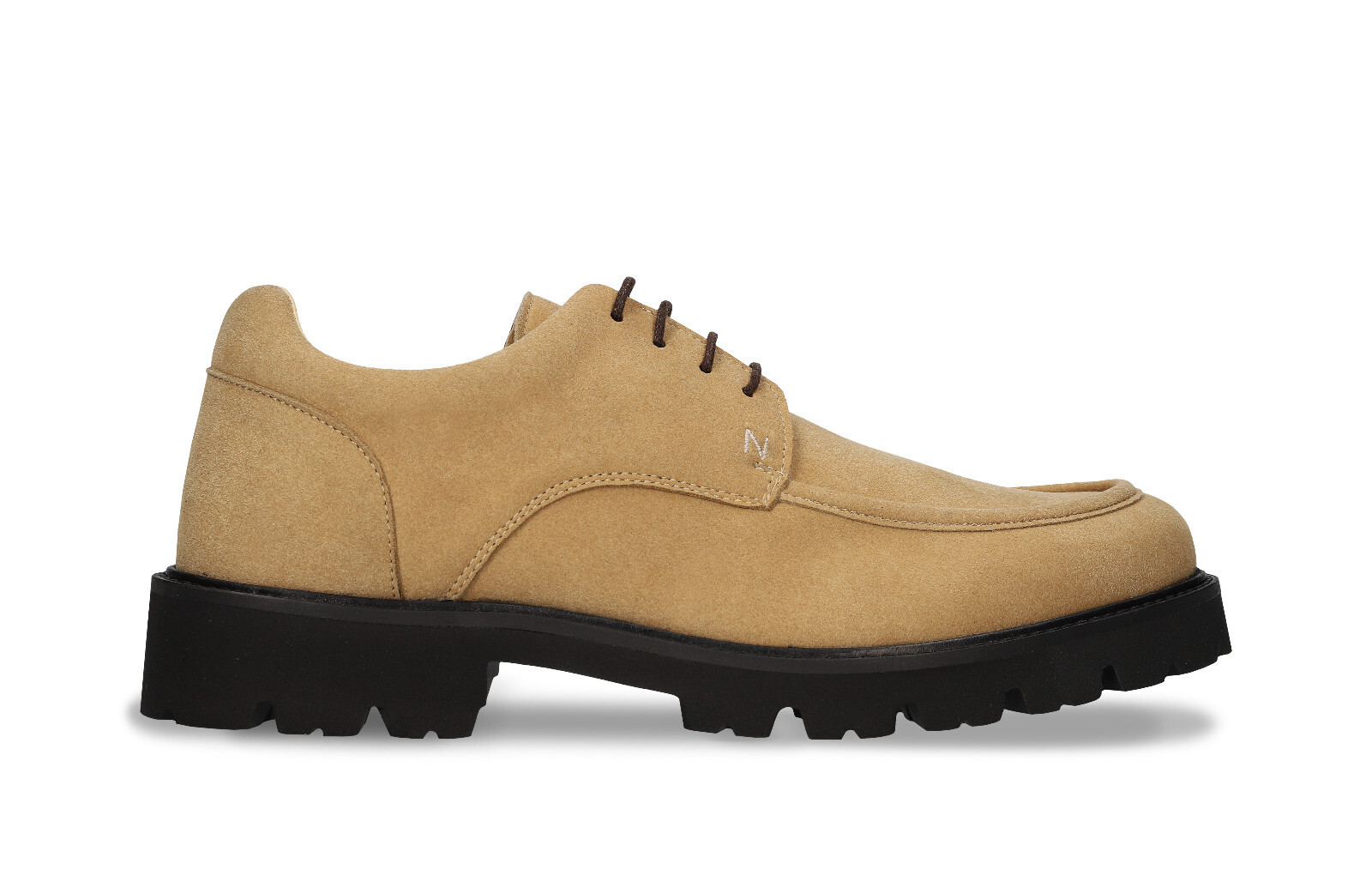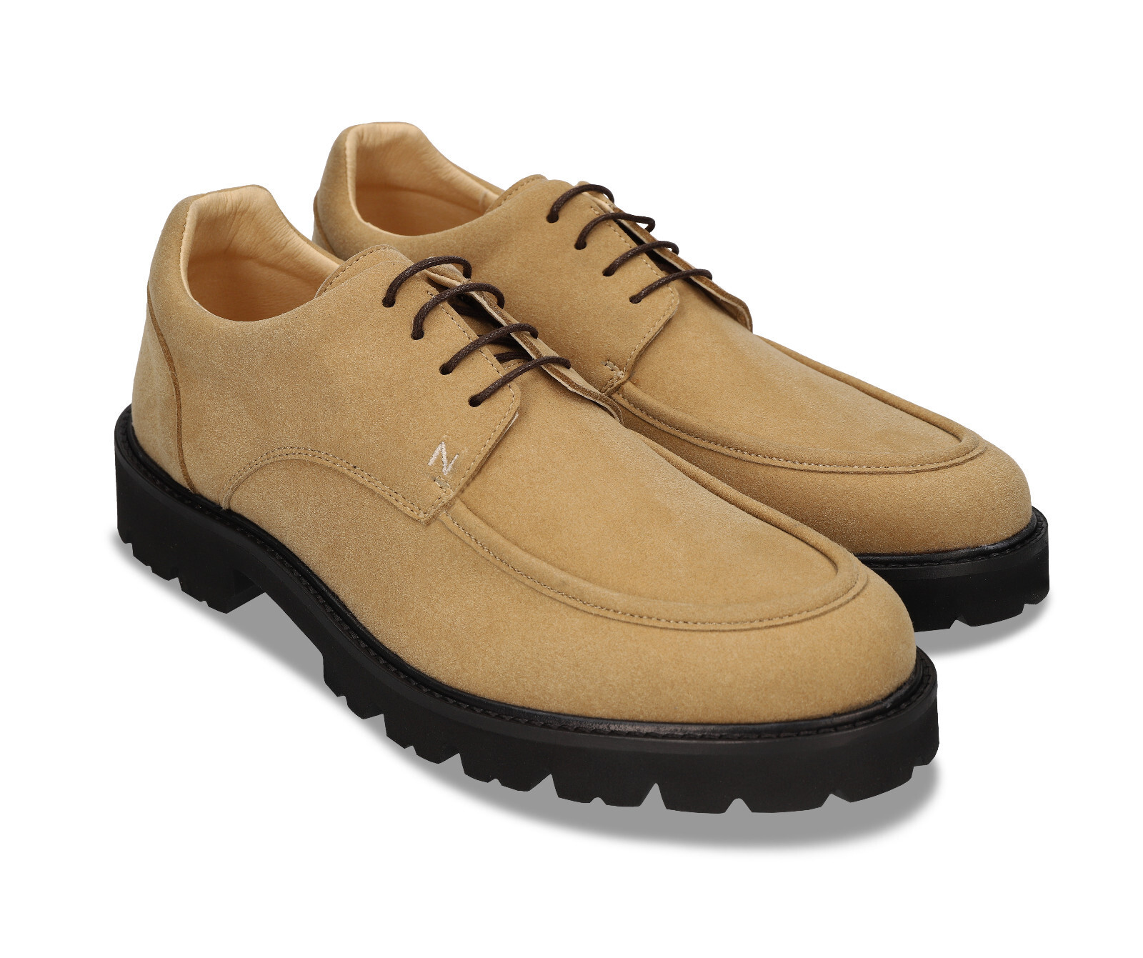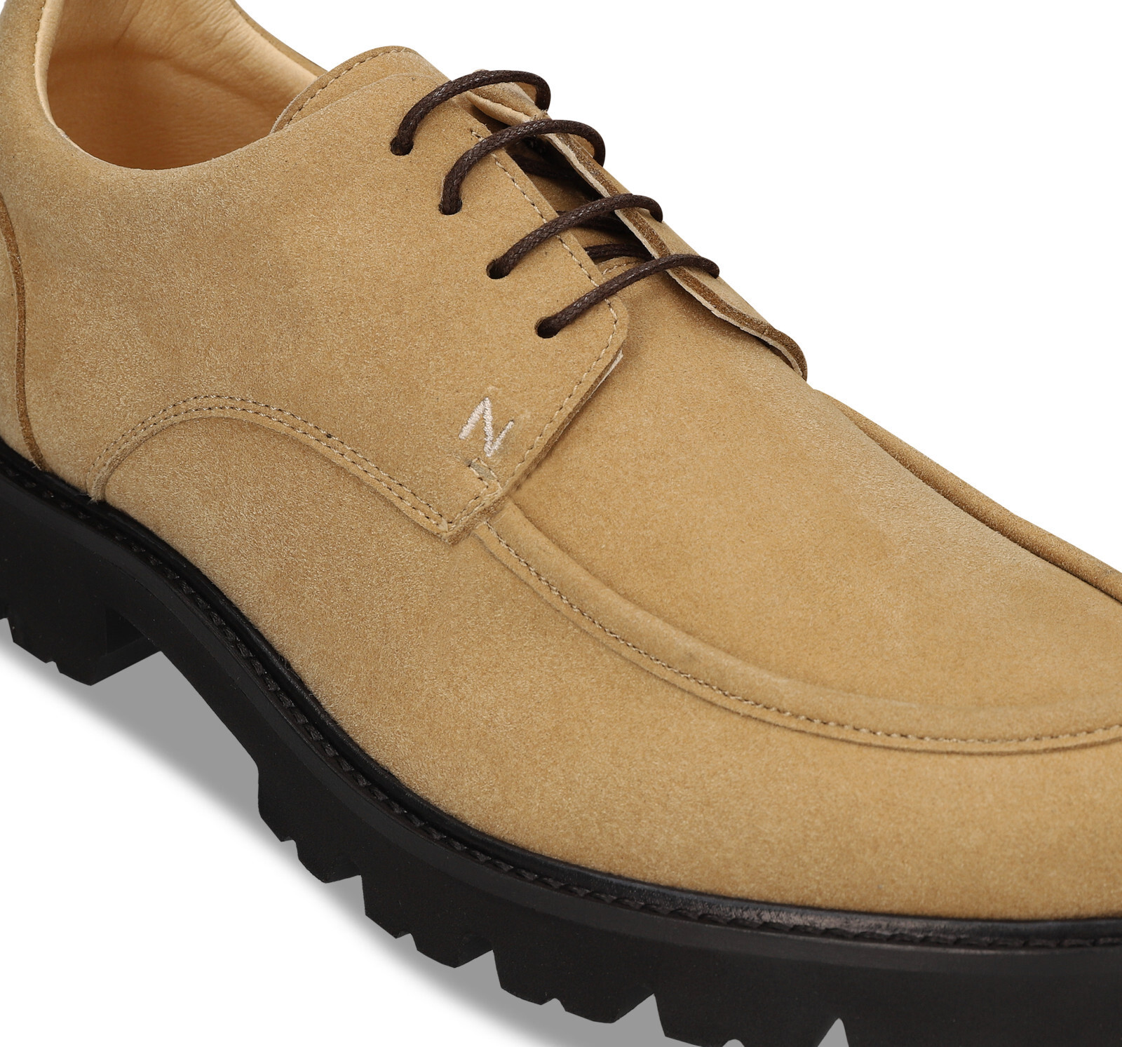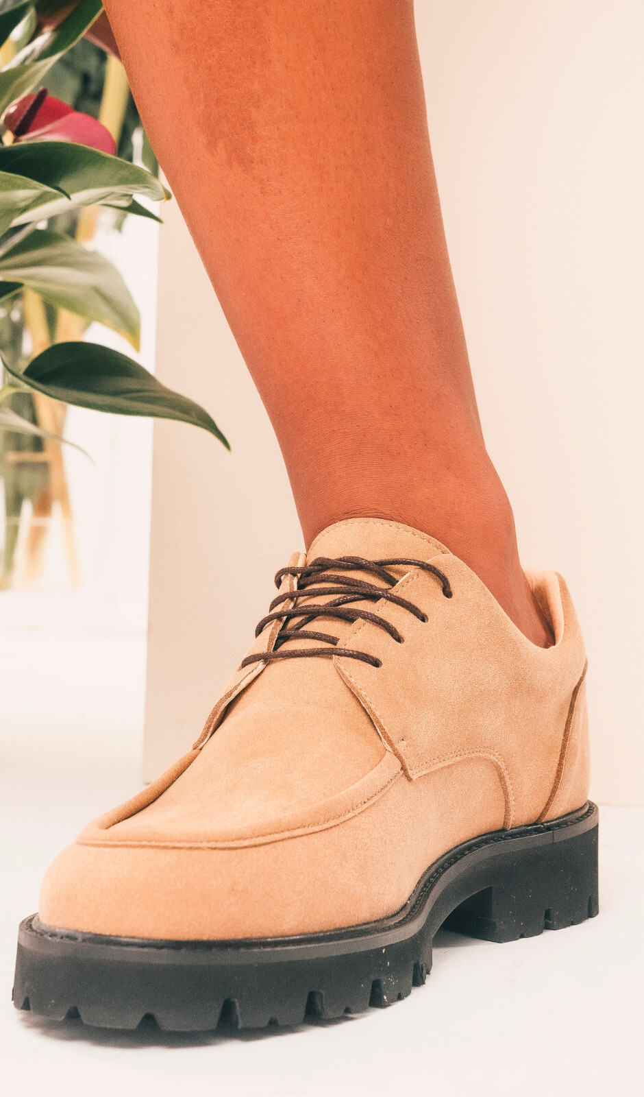 Zapatos derby hombre veganos beige en Microsuede planos con suela gruesa casual