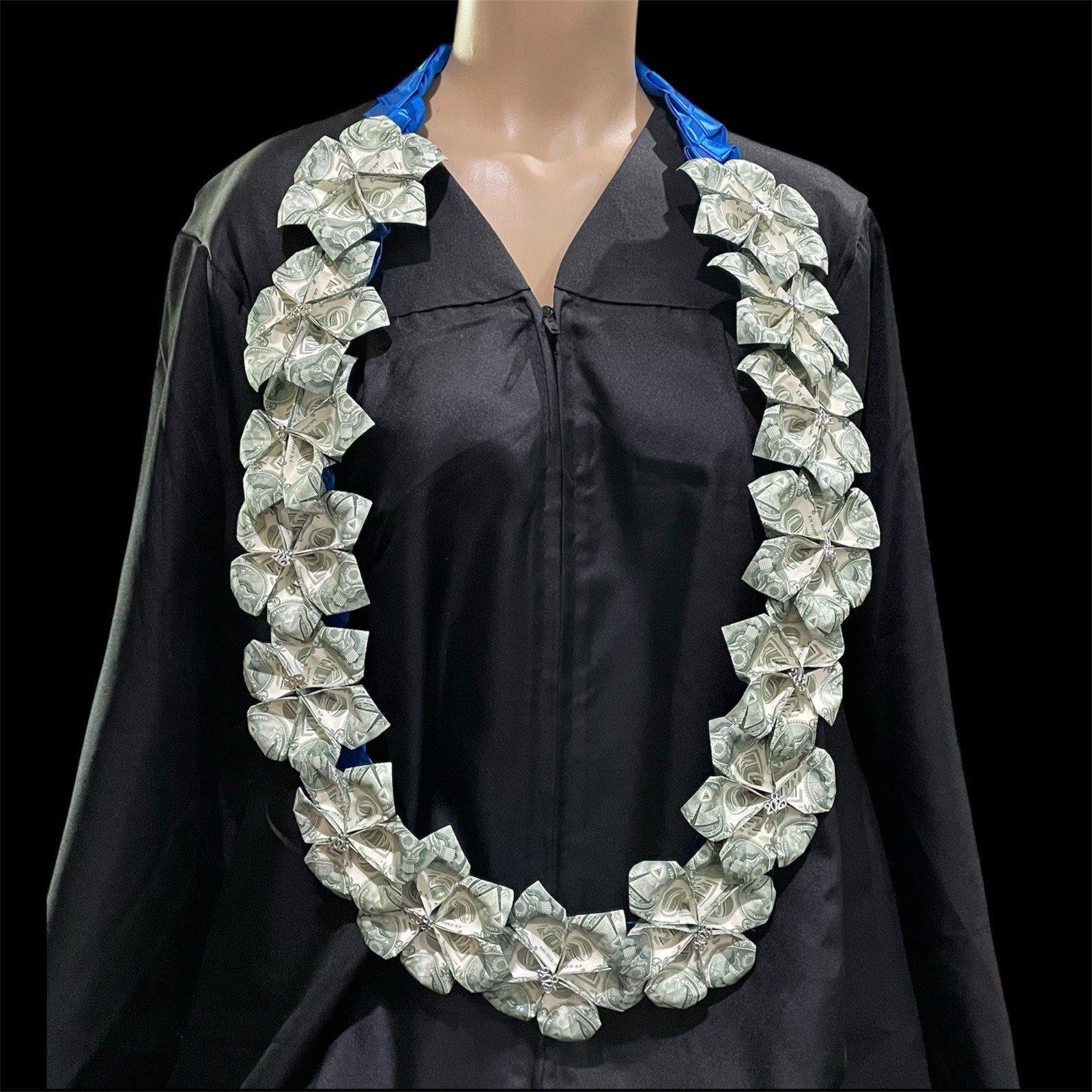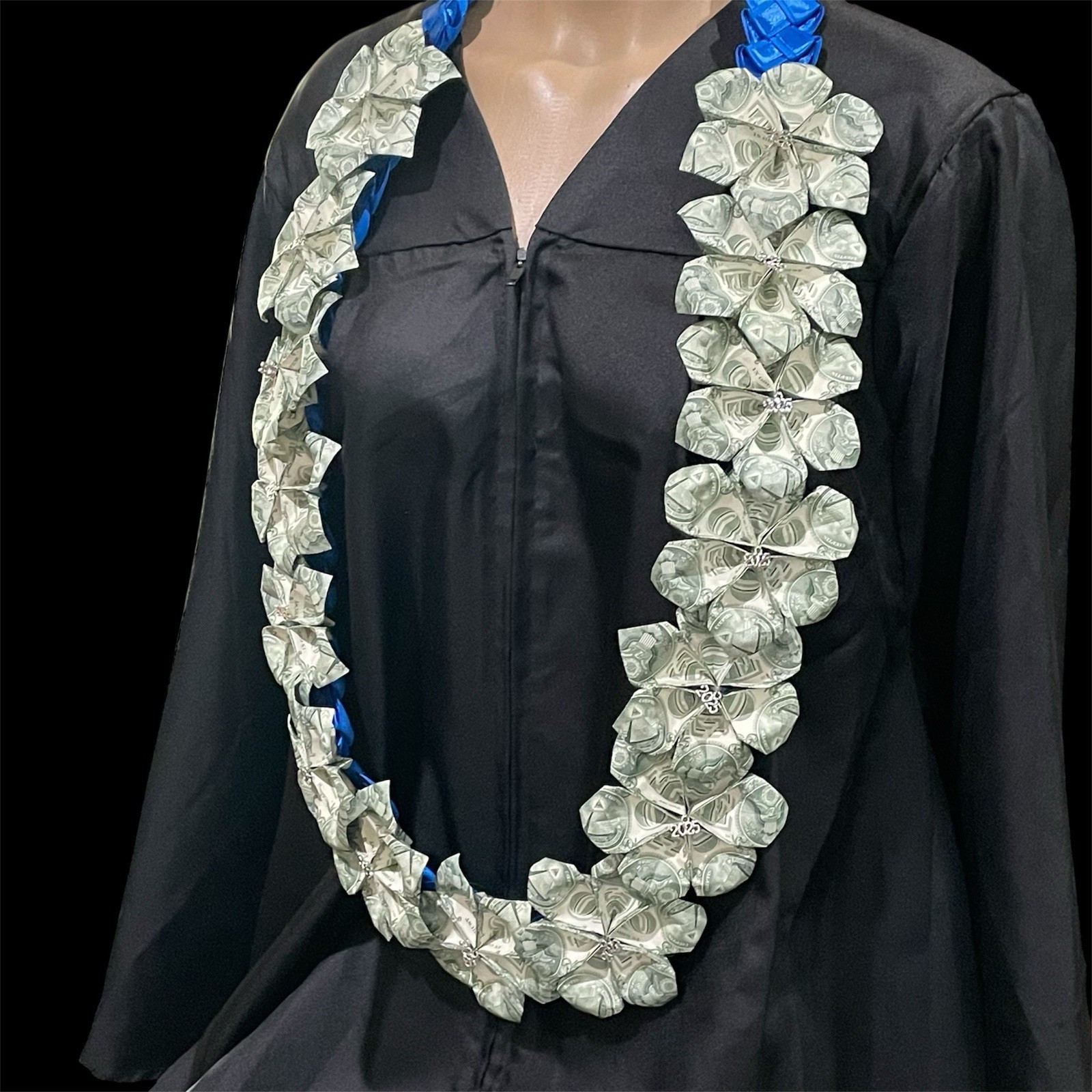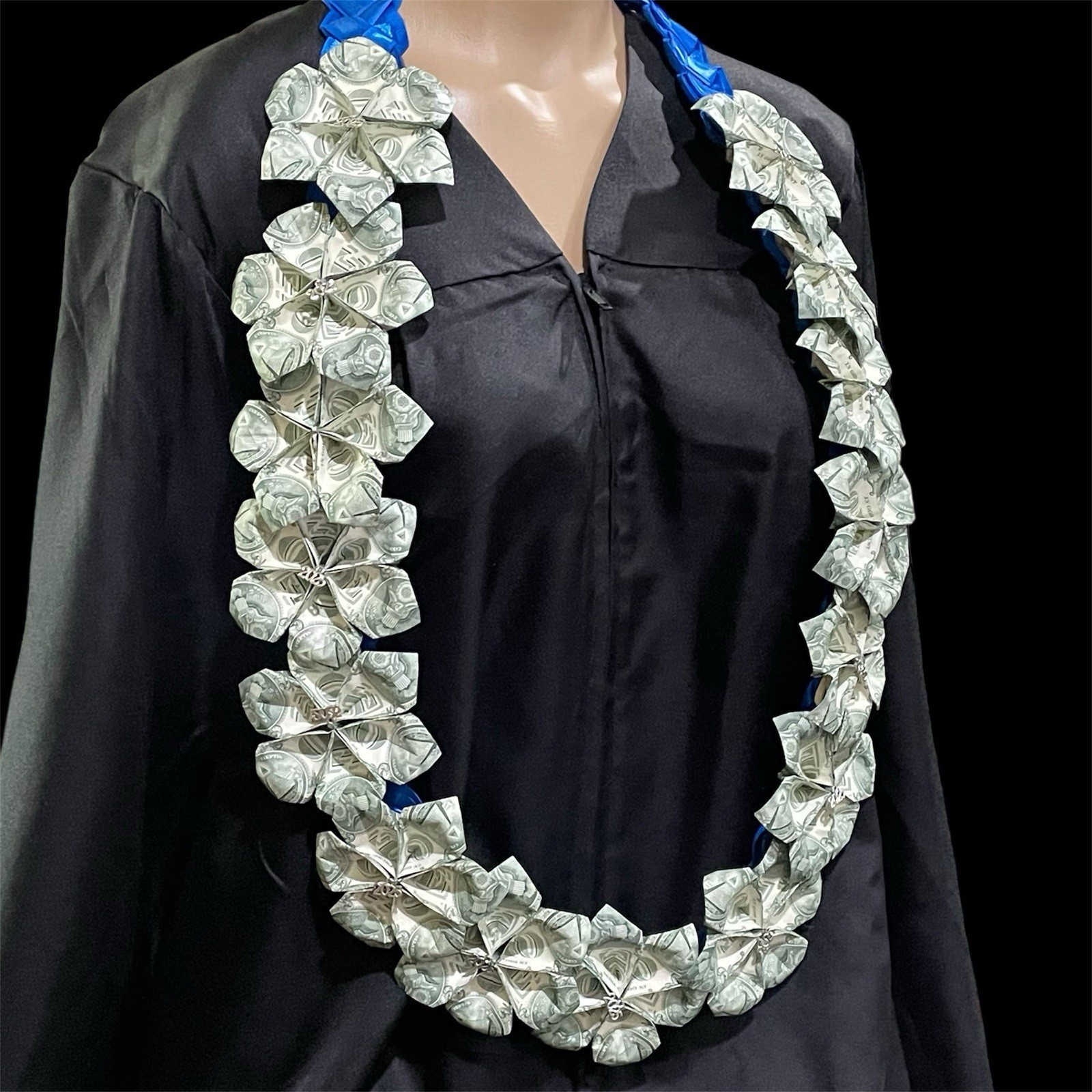 Gorgeous blue satin and grosgrain 4 strand long braided lei. Folded flowers made with one dollar bills. Each flower is $3 so it has $45 on it (15 flowers). It hangs approximately 24? and the width of the braid is approximately 1.5? wide. Each money flower has a 2025 charm in the center.