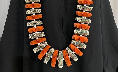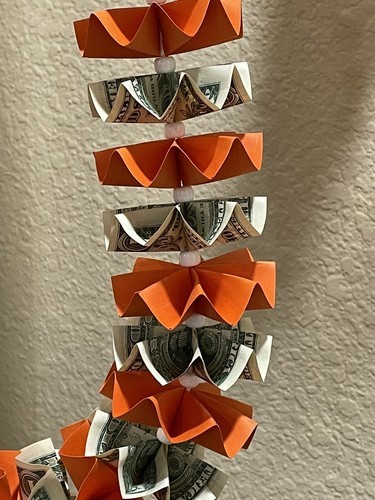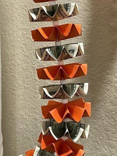 Graduation Money Lei 30 Crisp New Bills Folded Orange Card stock W/white Beads
