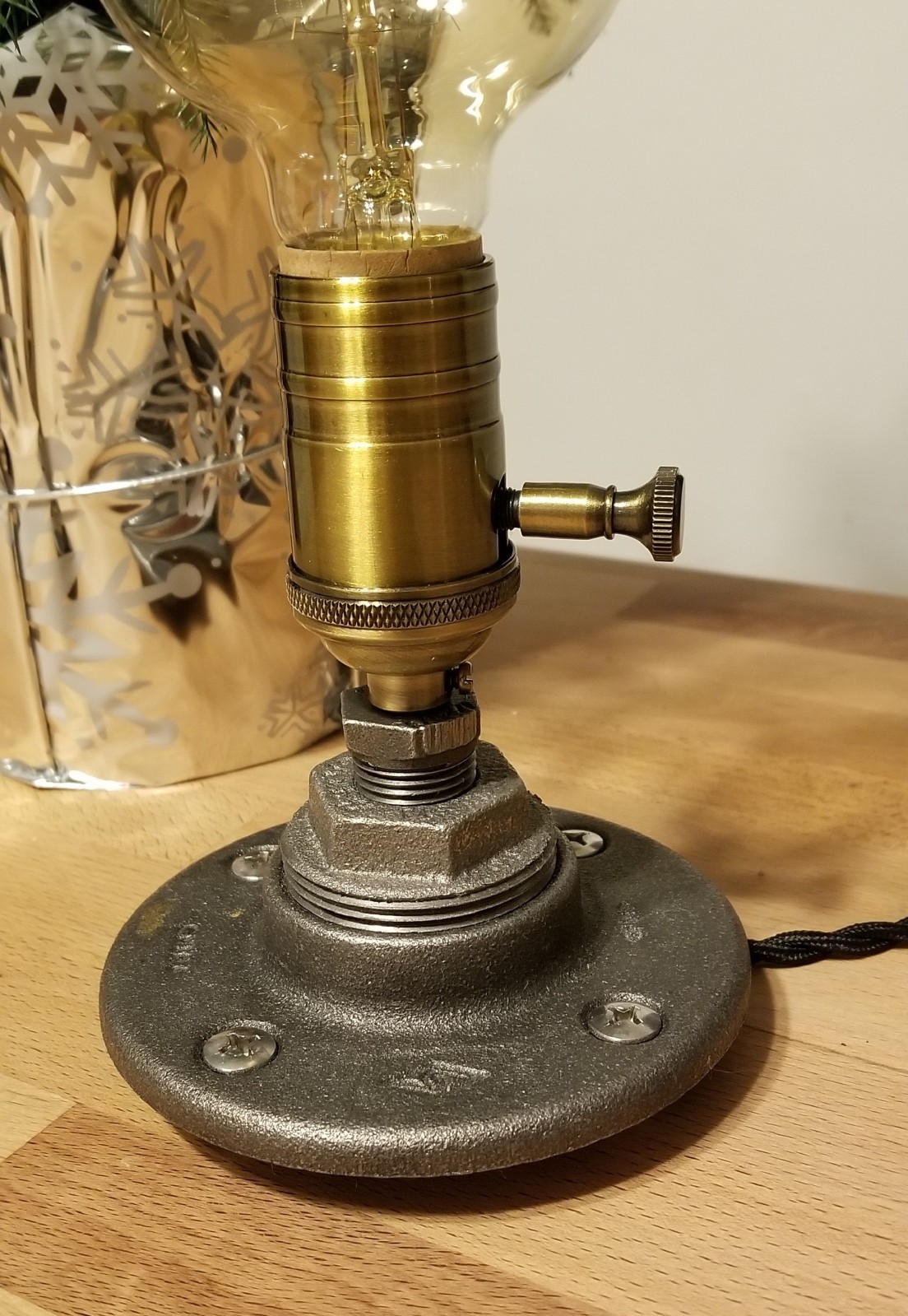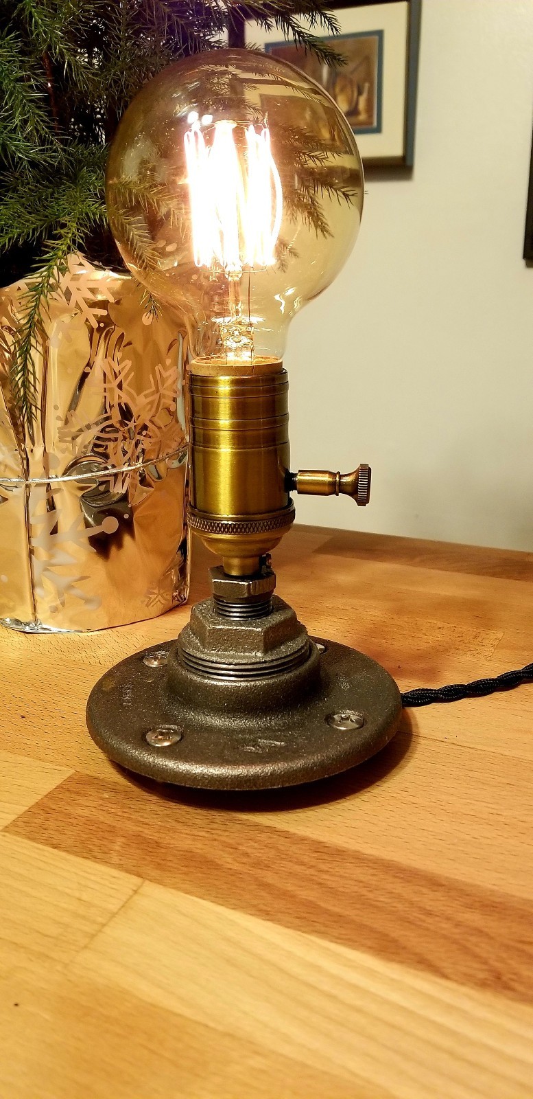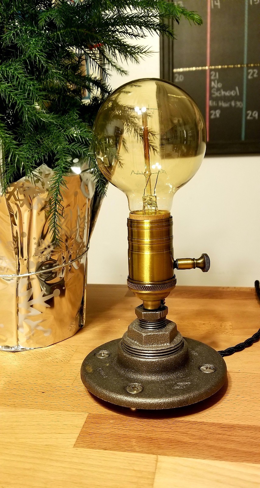 Simple elegance defines this small custom handmade industrial steel pipe desk lamp. The lamp focal point is the heavy duty stylish antiqued brass socket that comes in either a dimmer or standard three-way switch. I've added a large round Edison bulb to finish off the look.