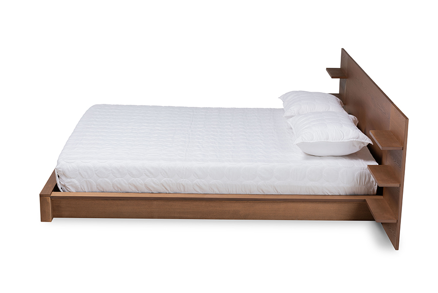 Outfit your bedroom with the modern convenience of the Adelino bed. Made in Malaysia, the Adelino is crafted from sturdy wood showcasing a warm walnut brown finish. Its low, inset platform lends an ultra modern look, while six handy shelves built into the headboard provide on-hand storage for bedside essentials and decorative items. Requiring assembly, the Adelino is equipped with wood slats that eliminate the need for a box spring. With a broad yet elegant design, the Adelino bed is an excellent addition to the modern home.