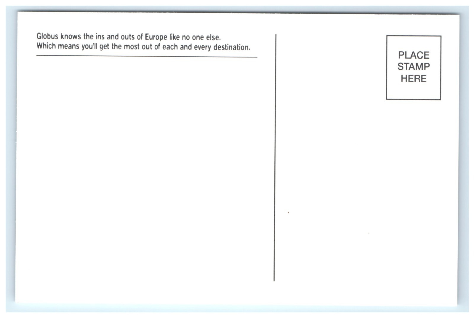 ? Back Unused; Globus promotional postcard; caption promoting travel experiences in Europe