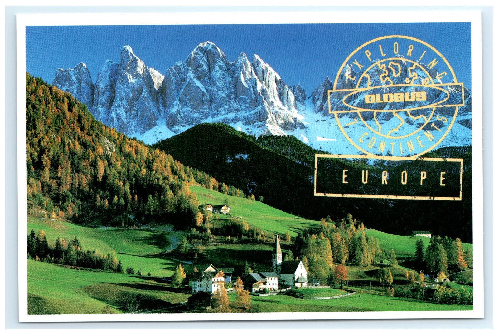 This postcard captures a breathtaking view of the Dolomites in Europe, with snowcapped peaks rising above a peaceful alpine village and rolling green hills. Issued as part of Globus?s promotional travel series, the card highlights the natural beauty and charm of Europe?s mountainous landscapes.