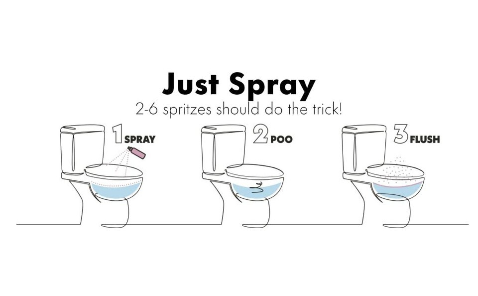 To cover the track of what comes out your crack, shake well, spray 2-6 times directly into the toilet, unload your cargo, then flush and walk away feeling like a new person and leaving the bathroom smelling better than you found it.