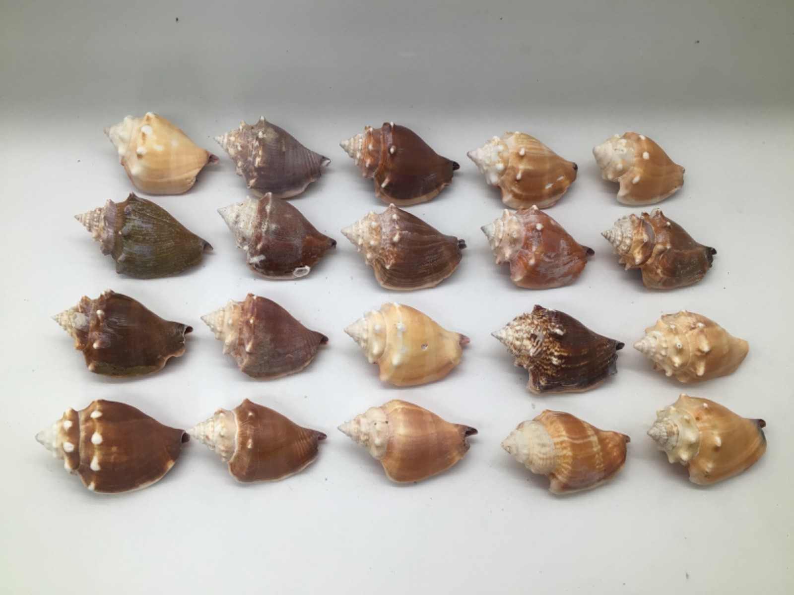 This lot of 20 Florida Fighting Conch seashells was collected from Florida beaches and measures between 3 and 3.5 inches each. With their spiral ridges and rich brown, orange, and cream tones, they are excellent for coastal displays, nautical home decor, or shell craft projects.