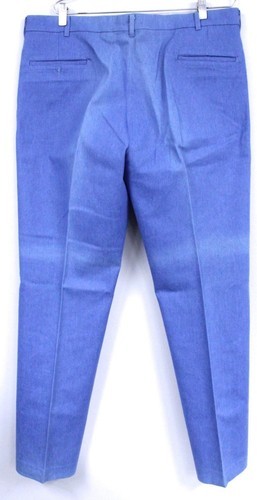 Classic pair of early 1970s vintage men?s denim slacks, cut in a straight leg with easy-care cotton blend construction. Blue denim with yellow-gold stitching gives them a timeless retro look. No visible brand tag.