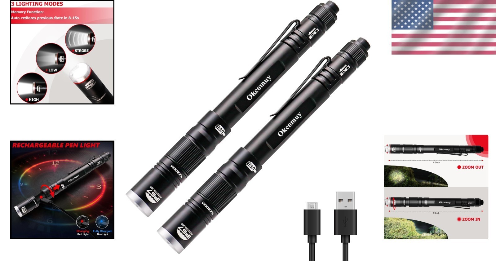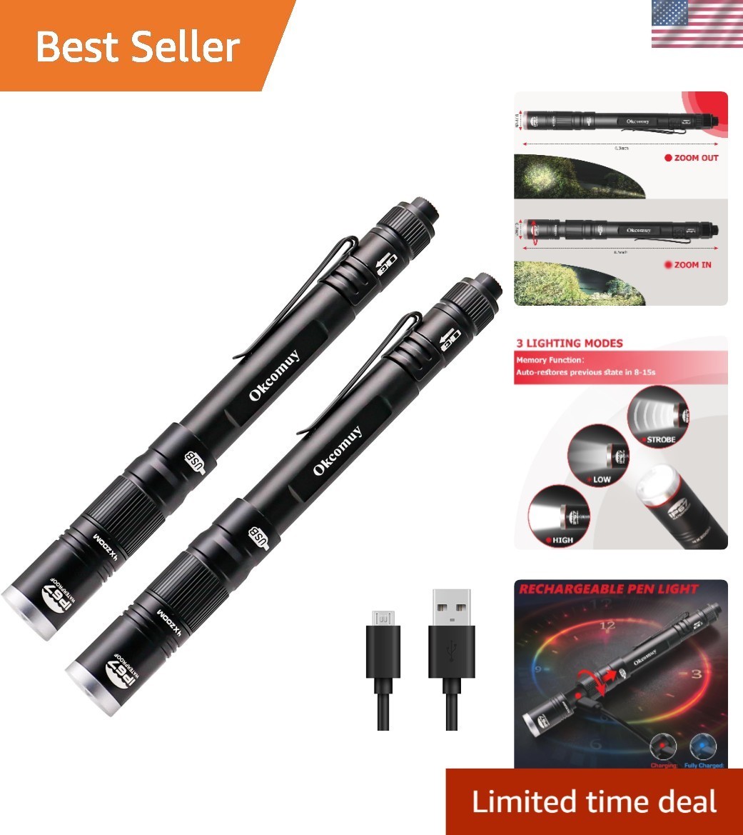 Rechargeable 300 Lumen Pocket Flashlight - Waterproof & Adjustable Modes, 2 Pack