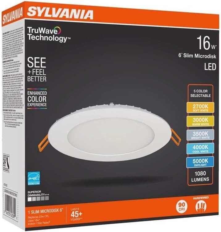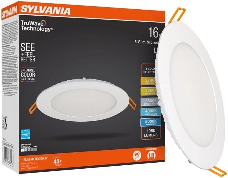 The SYLVANIA 62389 canless LED recessed downlight is a complete, retrofit-ready lighting solution designed for new construction and remodel applications without requiring a separate housing. Featuring a built-in driver and integrated 16W LED array, it delivers 1080 lumens of uniform, glare-free illumination with a CRI greater than 90 ? ensuring accurate color representation in living spaces, kitchens, hallways, and bathrooms. The 6-inch white trim blends seamlessly into ceilings, while the five selectable color temperatures (2700K?5000K) allow customization of ambiance via a simple toggle switch ? from warm evening glow to crisp daylight clarity. Instant-on performance provides full brightness immediately, with no warm-up or flicker, and consistent lamp-to-lamp color ensures even lighting across multiple fixtures. Designed for indoor and outdoor dry, damp, and wet locations, it is rated for use in showers, porches, and covered patios.