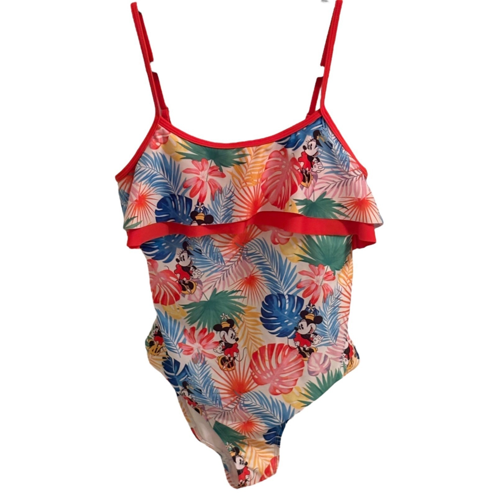 This swimsuit combines vibrant tropical prints with a cheerful Minnie Mouse design, featuring ruffle accents and adjustable straps for added comfort and style.