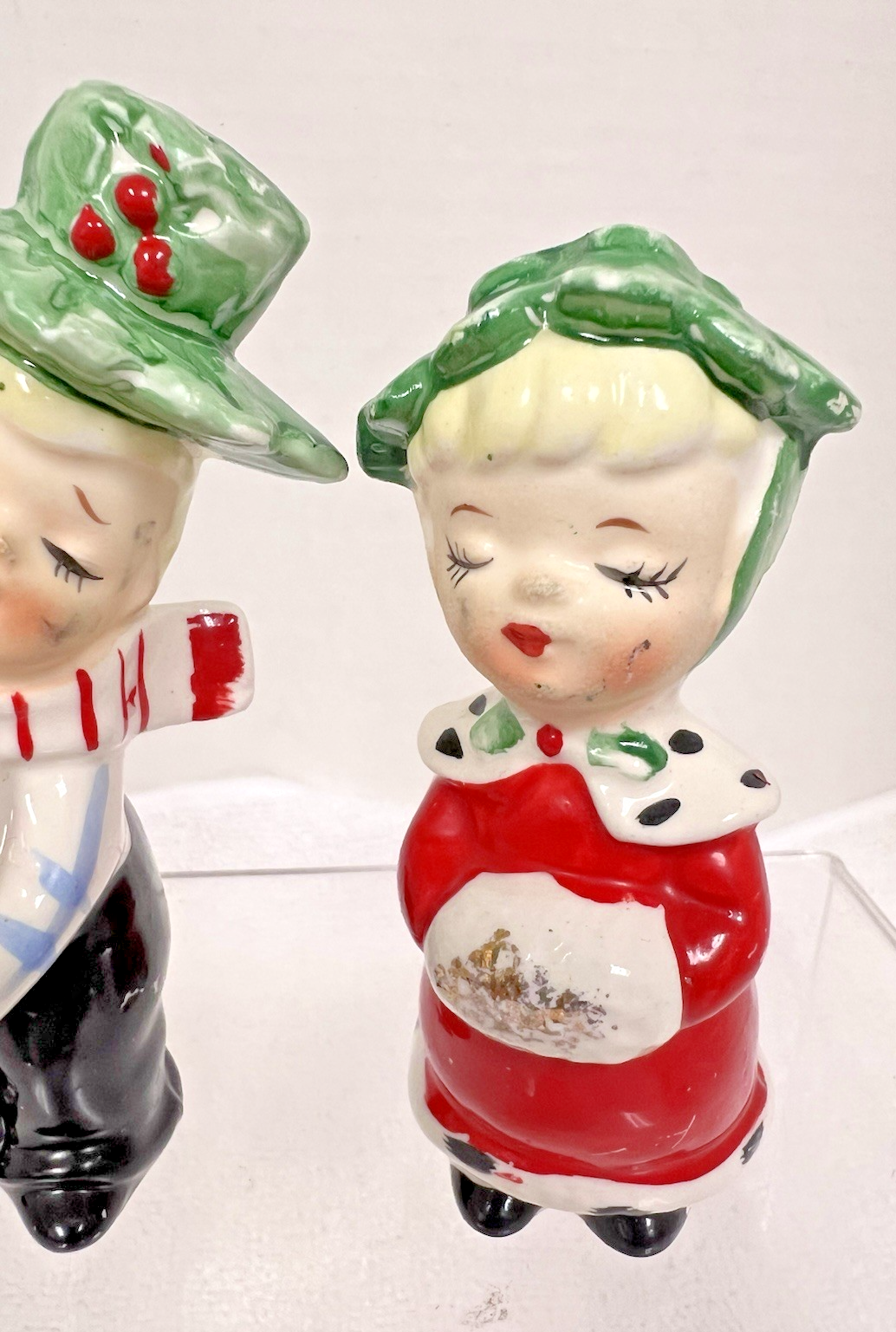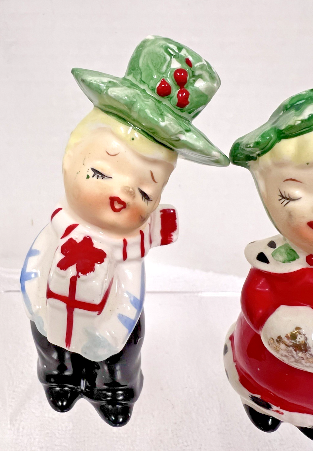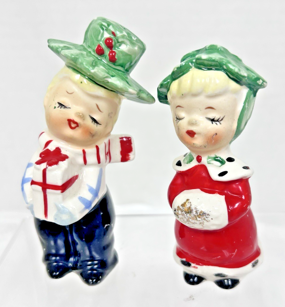 Vintage Christmas Boy Girl Salt Pepper w Holly Hats Scarfs Presents Kissing He stands 4 inches she is 3 3/4 the red on her coat and the balck on his pants have wear but no chips or breaks the holly is hand painted in a water-color way...