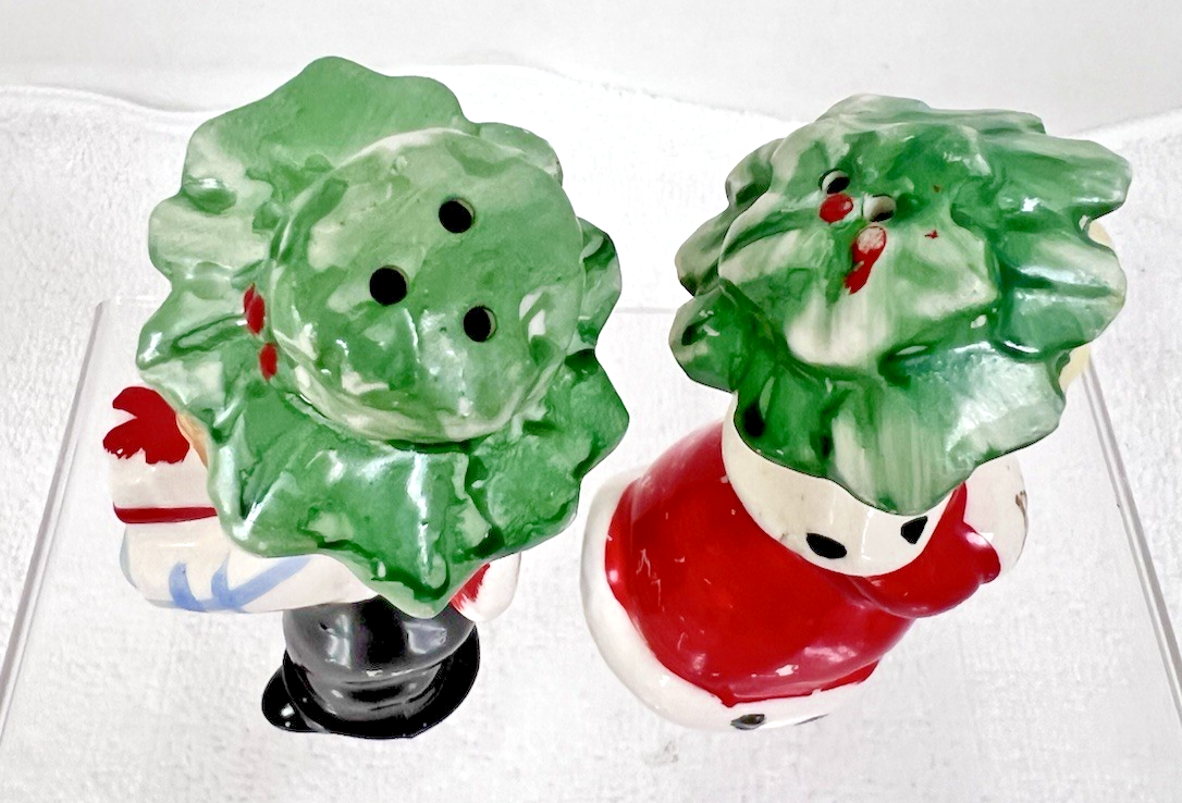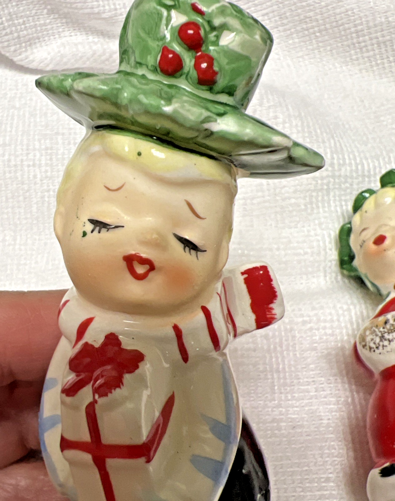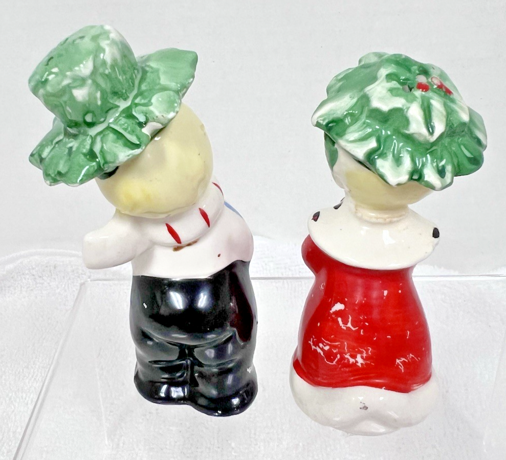 Vintage Christmas Boy Girl Salt Pepper w Holly Hats Scarfs Presents Kissing He stands 4 inches she is 3 3/4 the red on her coat and the balck on his pants have wear but no chips or breaks the holly is hand painted in a water-color way...