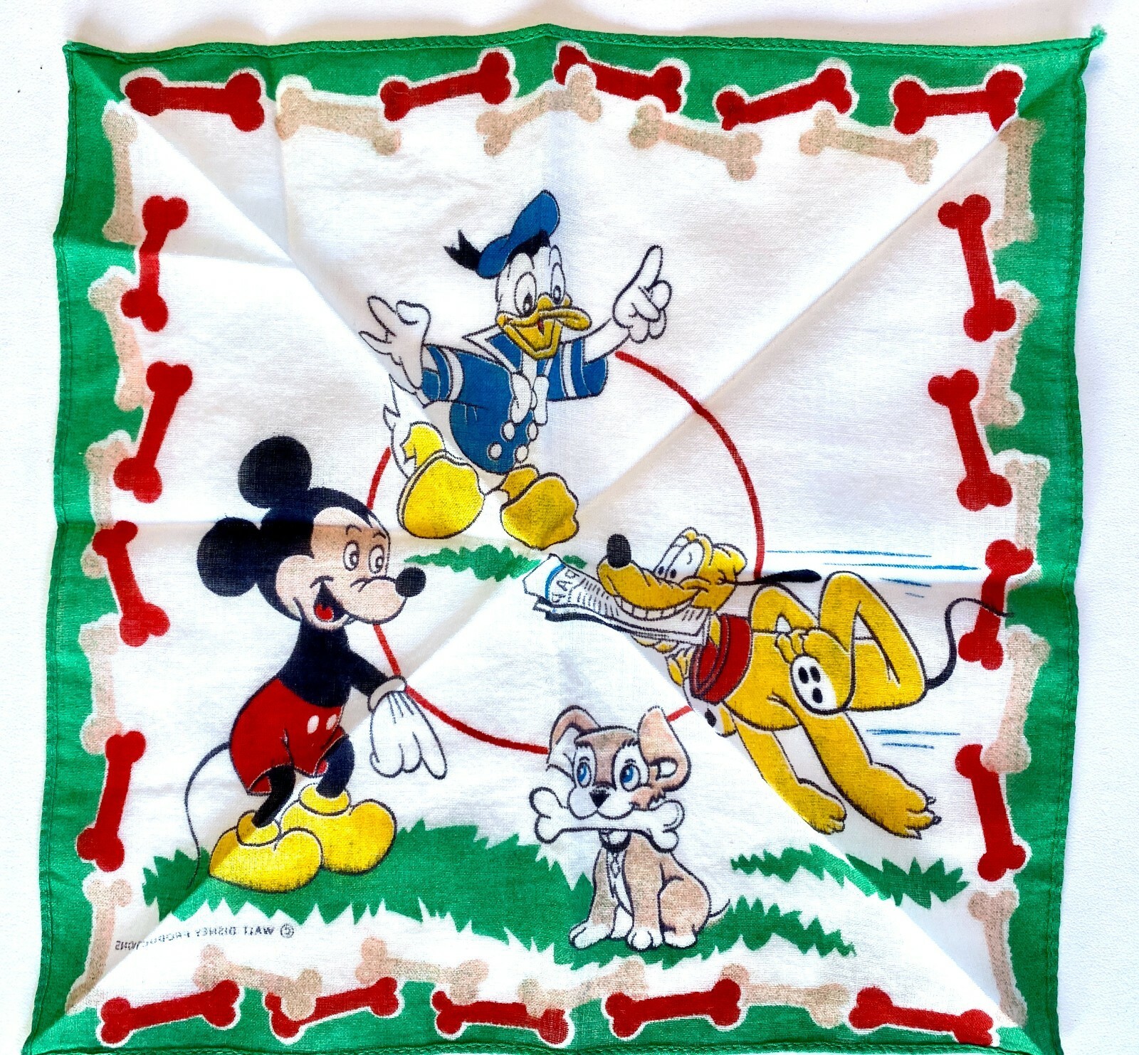 Child's Walt Disney Mickey Goofy Donald Bones Green Edge Handkerchief Vintage
