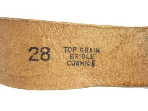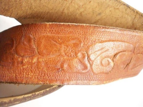 Vintage Hand Tooled Leather Belt Gun Buckle 1970's SZ 28 measures 30" x 1 3/8" hand tooled leather belt of Top Grain Briole Cowhide, with a sort of pot metal hook style buckle. The gun handle has a hot pink plastic piece on it. I wonder if there was some other plastic on the rest. This is as found. The leather isn't all that nice though it is in very good condition. The buckle measures 3 x 2 1/2".