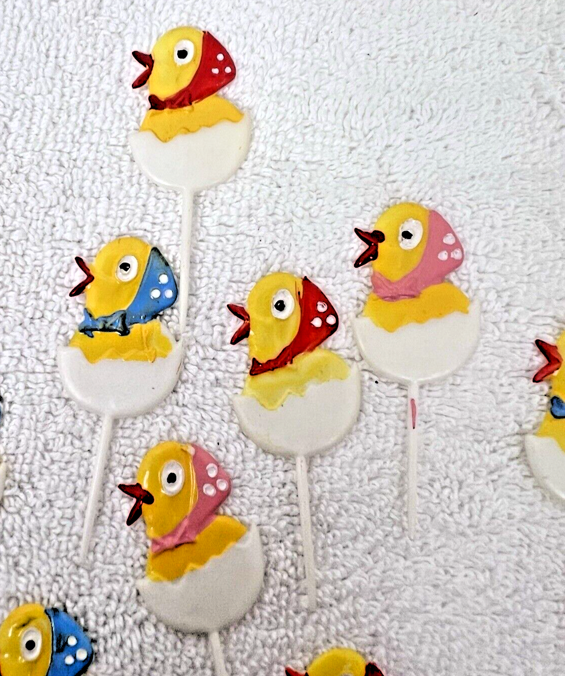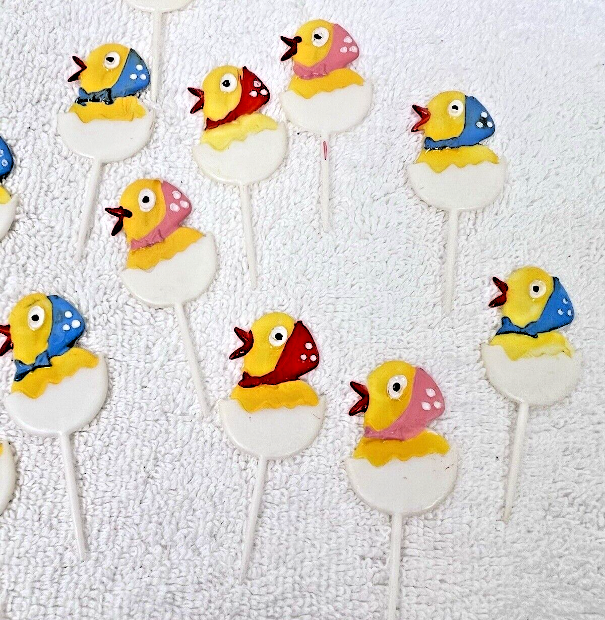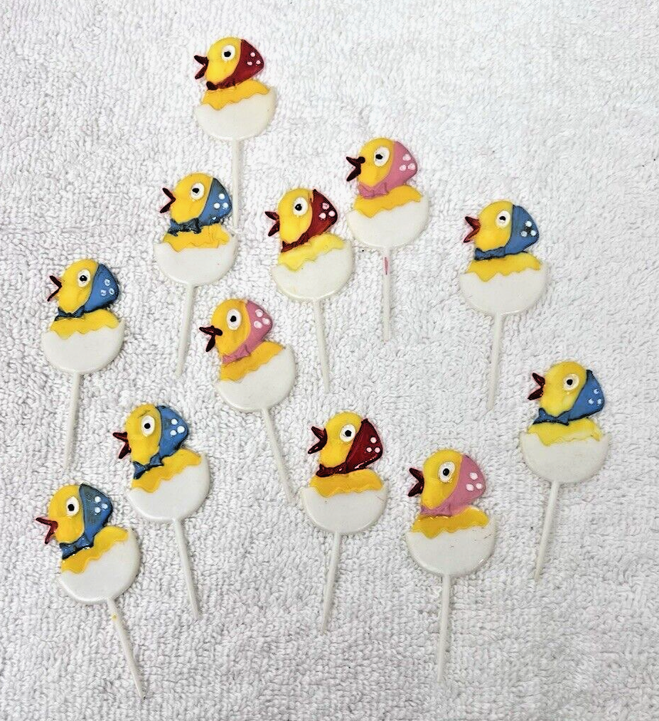 12 Vintage Easter Chick Cup Cake Toppers Yellow Bird 1/2 Egg Shell Dot Scarf