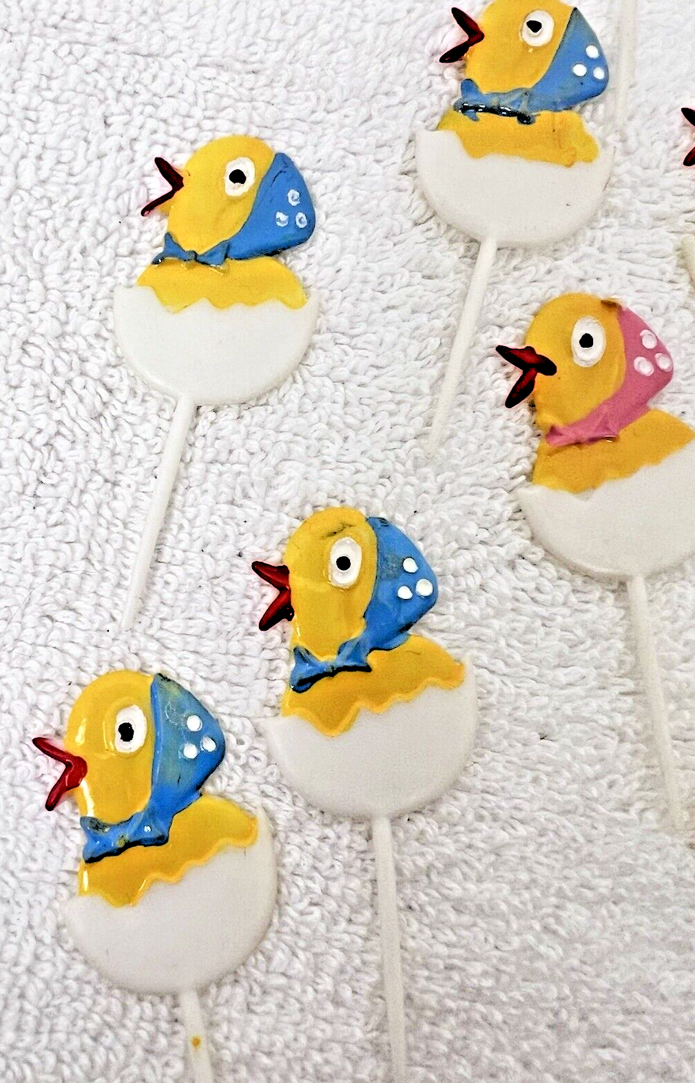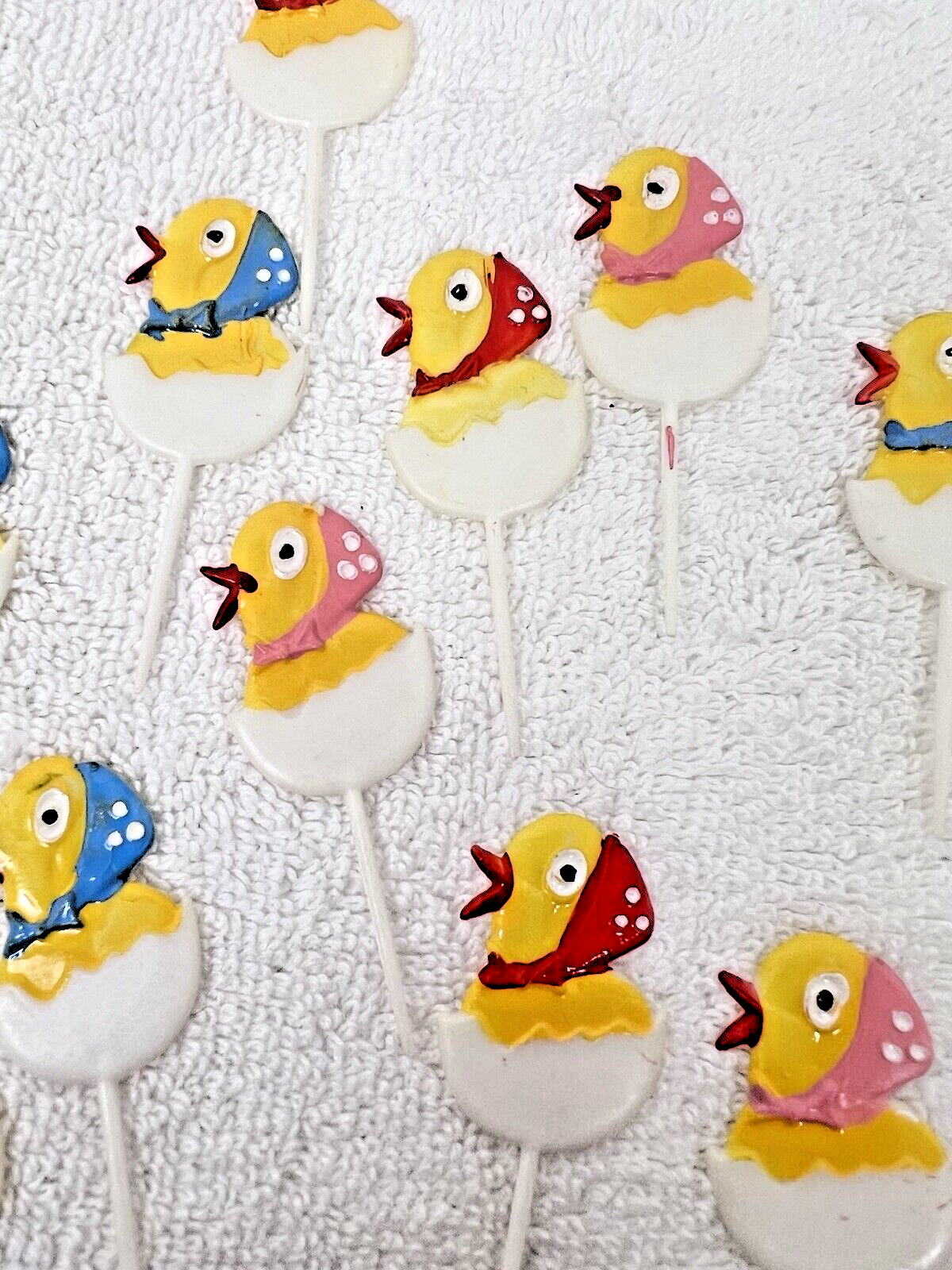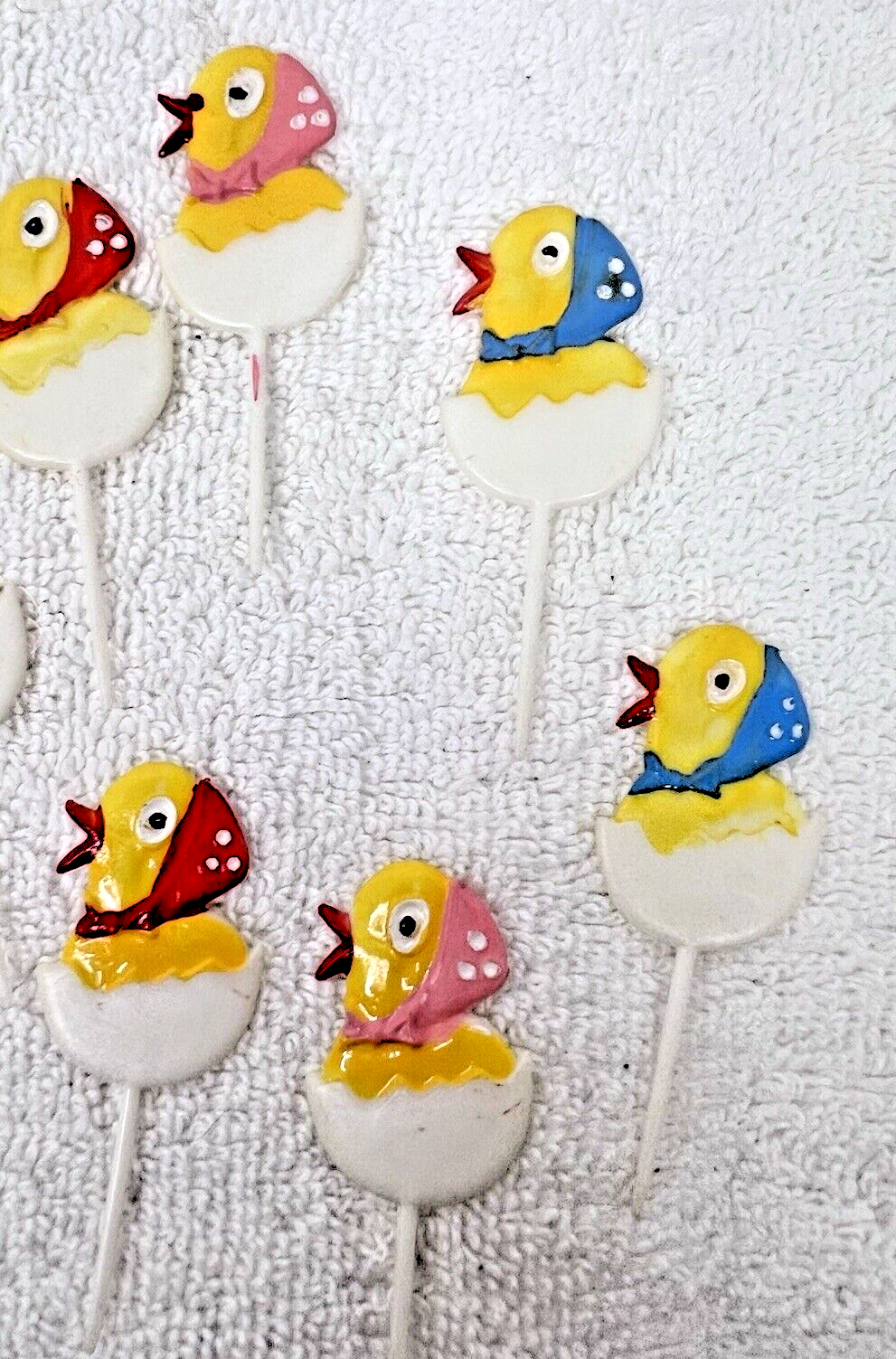 12 Vintage Easter Chick Cup Cake Toppers Yellow Bird 1/2 Egg Shell Dot Scarf